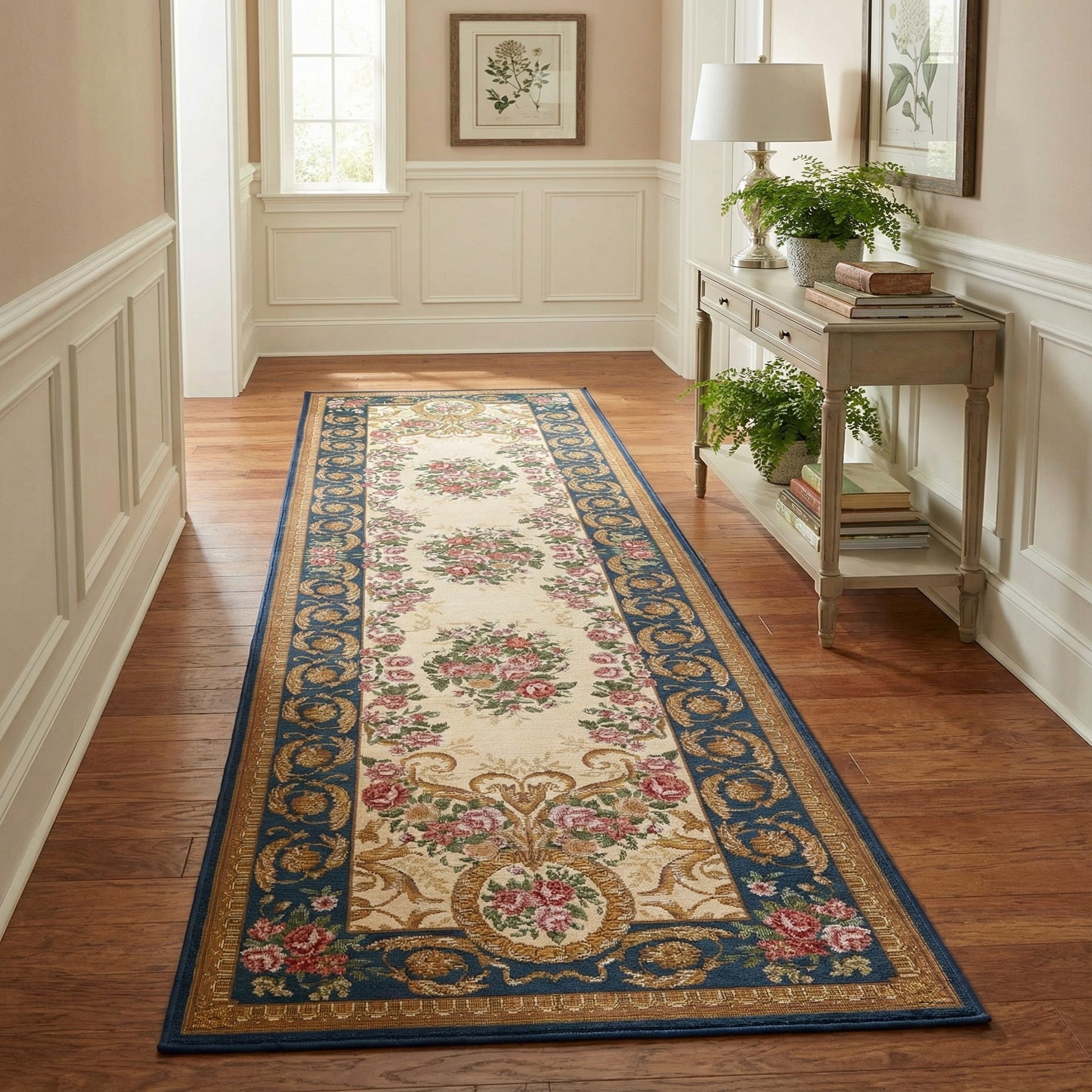 A 10 ft runner rug featuring a traditional Oriental pattern with an ivory center, blue border, and floral medallions.