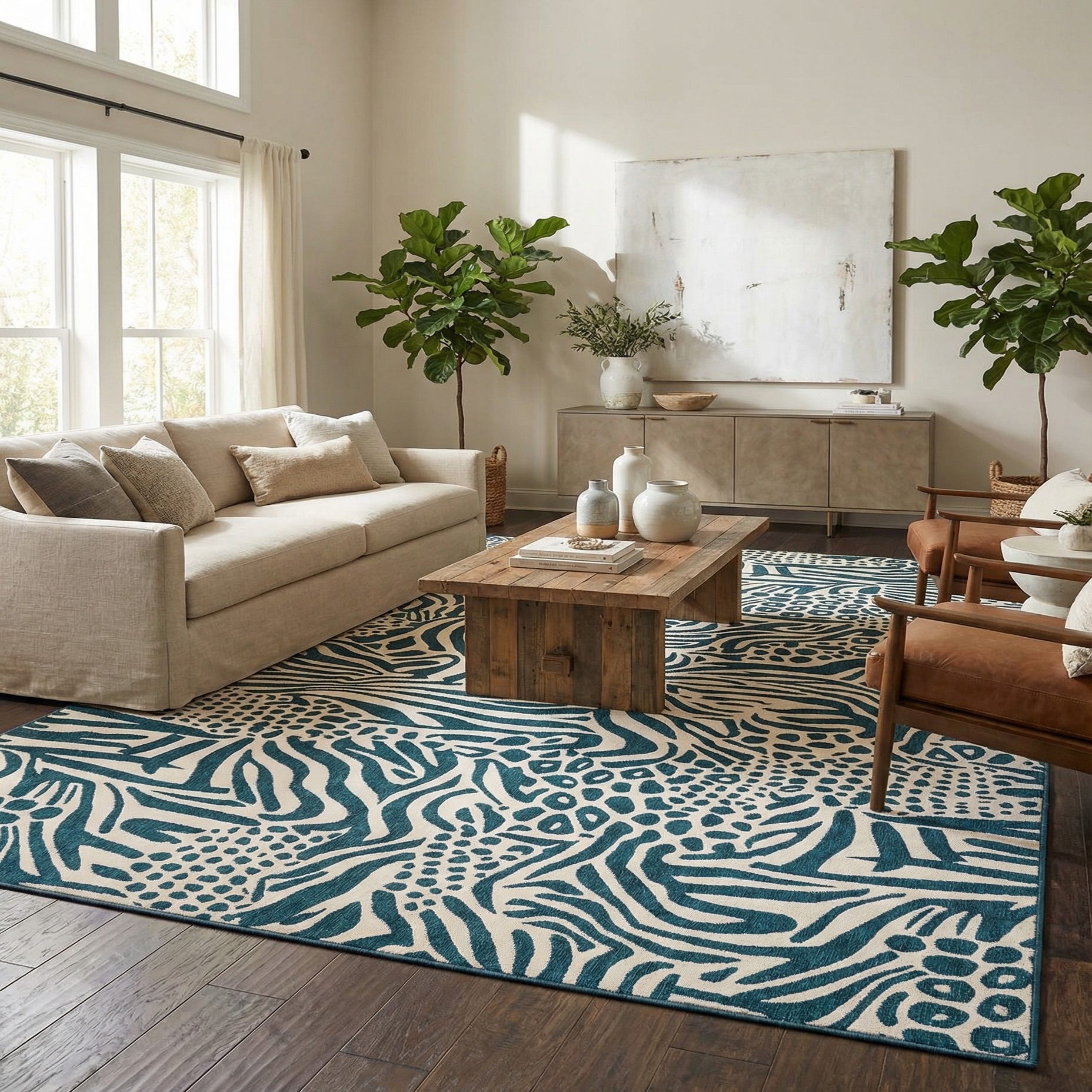 The Outdoor Safari collection offers this 10x14 rug, a robust addition to any outdoor or high-traffic indoor space. Machine-woven of 100% polypropylene, this rug boasts a dynamic animal print pattern that imparts a sense of wildlife adventure to your decor. Its navy blue and ivory color palette provides a rich contrast that is versatile enough to complement a range of design styles.