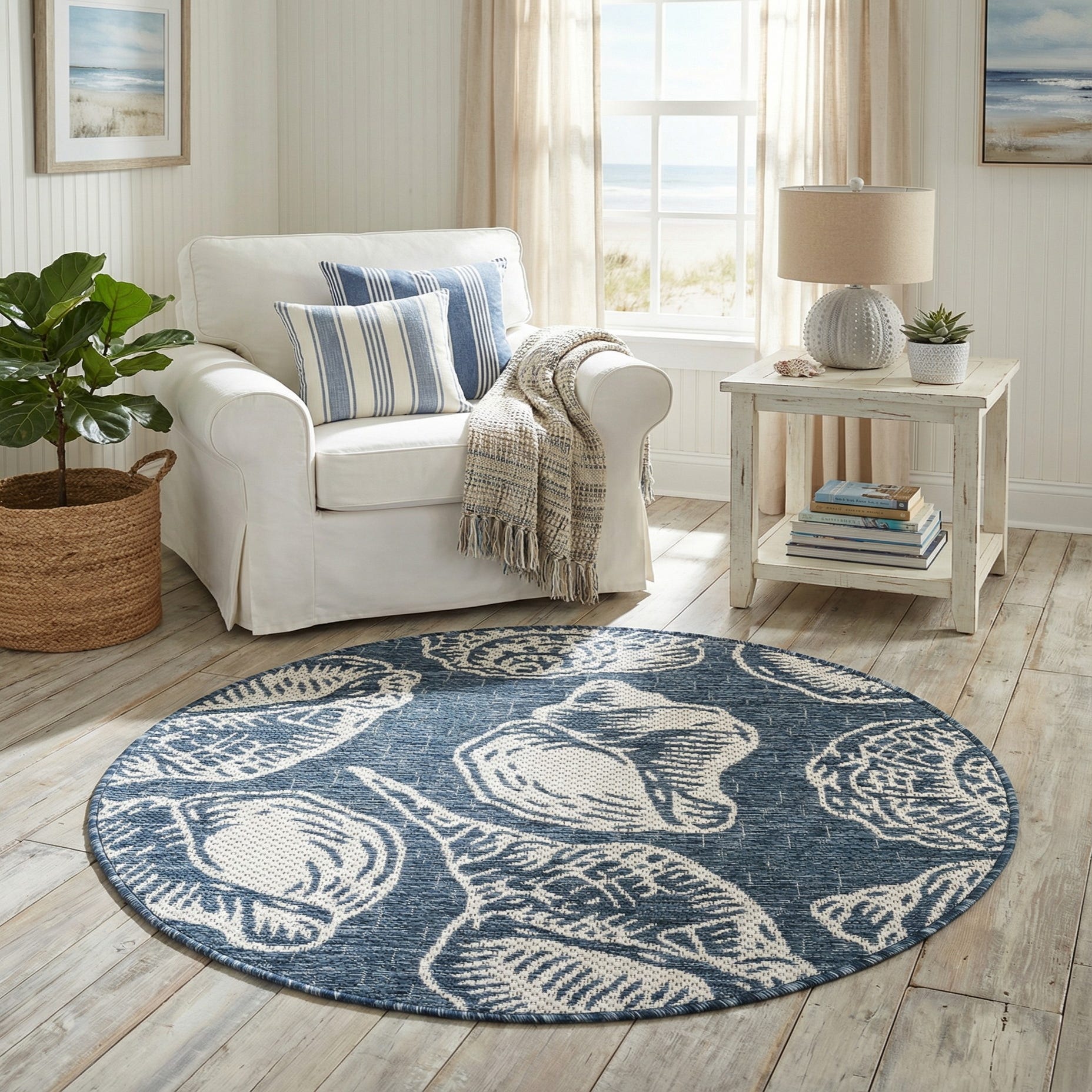 Bold, oversized shell motifs in ivory rest on a textured navy ground, creating a crisp coastal look with clear, sketch-like line work. The rug has a low-profile, flatwoven feel — you can feel the subtle ribbed texture underfoot — and the machine-made construction in 100% polypropylene gives a tightly woven surface that holds the graphic pattern with precise definition. The round silhouette and nautical motif make it an easy layering piece to anchor outdoor seating or a breezy sunroom.
