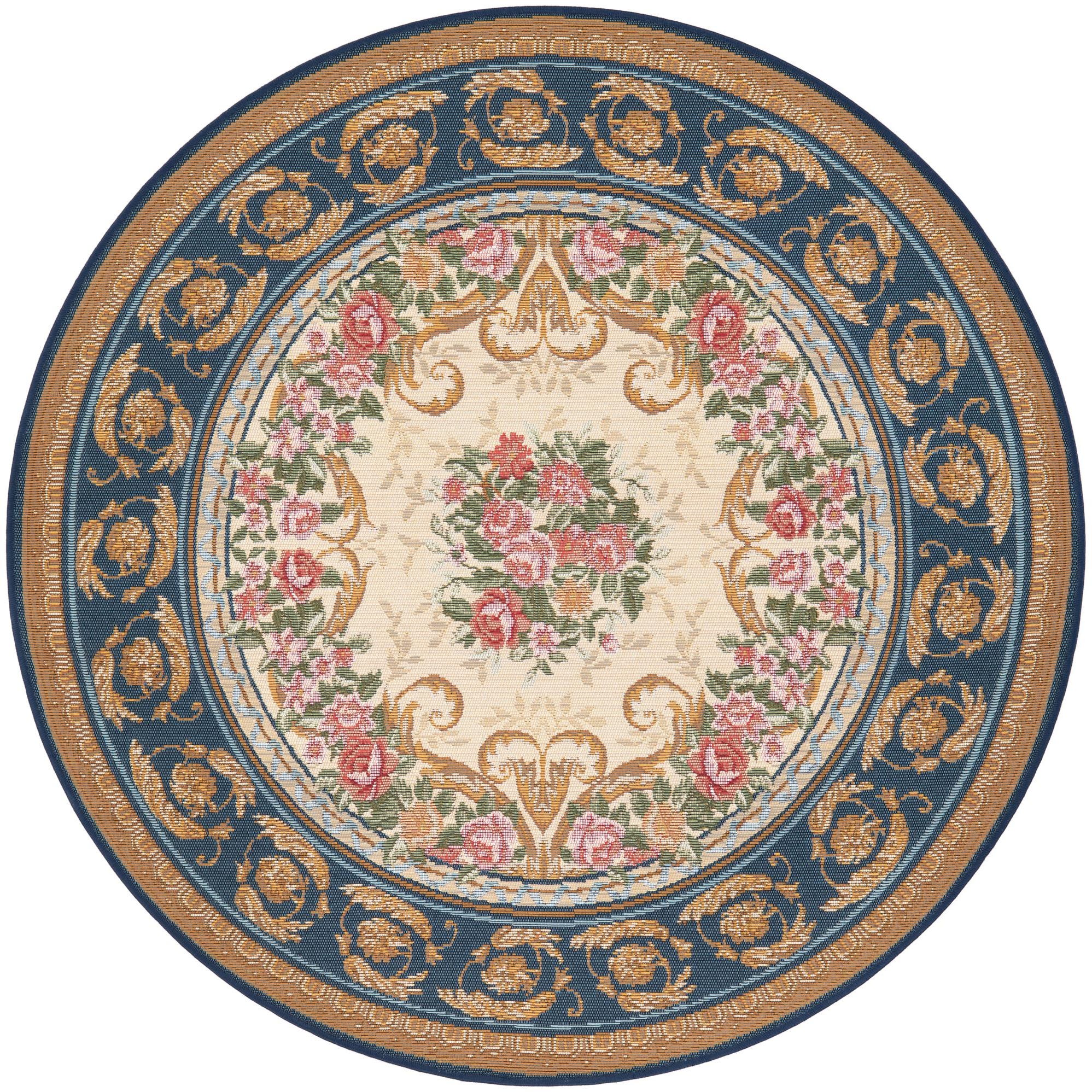 A 4' round blue and ivory rug with a classic floral pattern, featuring pink roses and gold scrollwork.