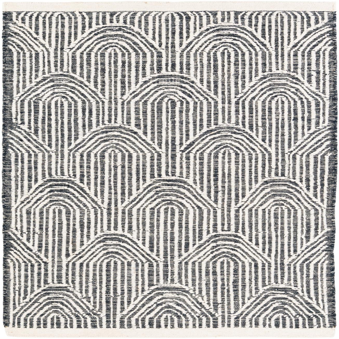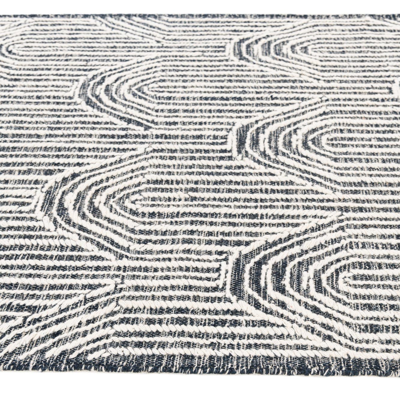 A 4x6 rectangular indoor jute rug featuring a modern abstract pattern of repeating dark blue arches and vertical stripes on an ivory background.