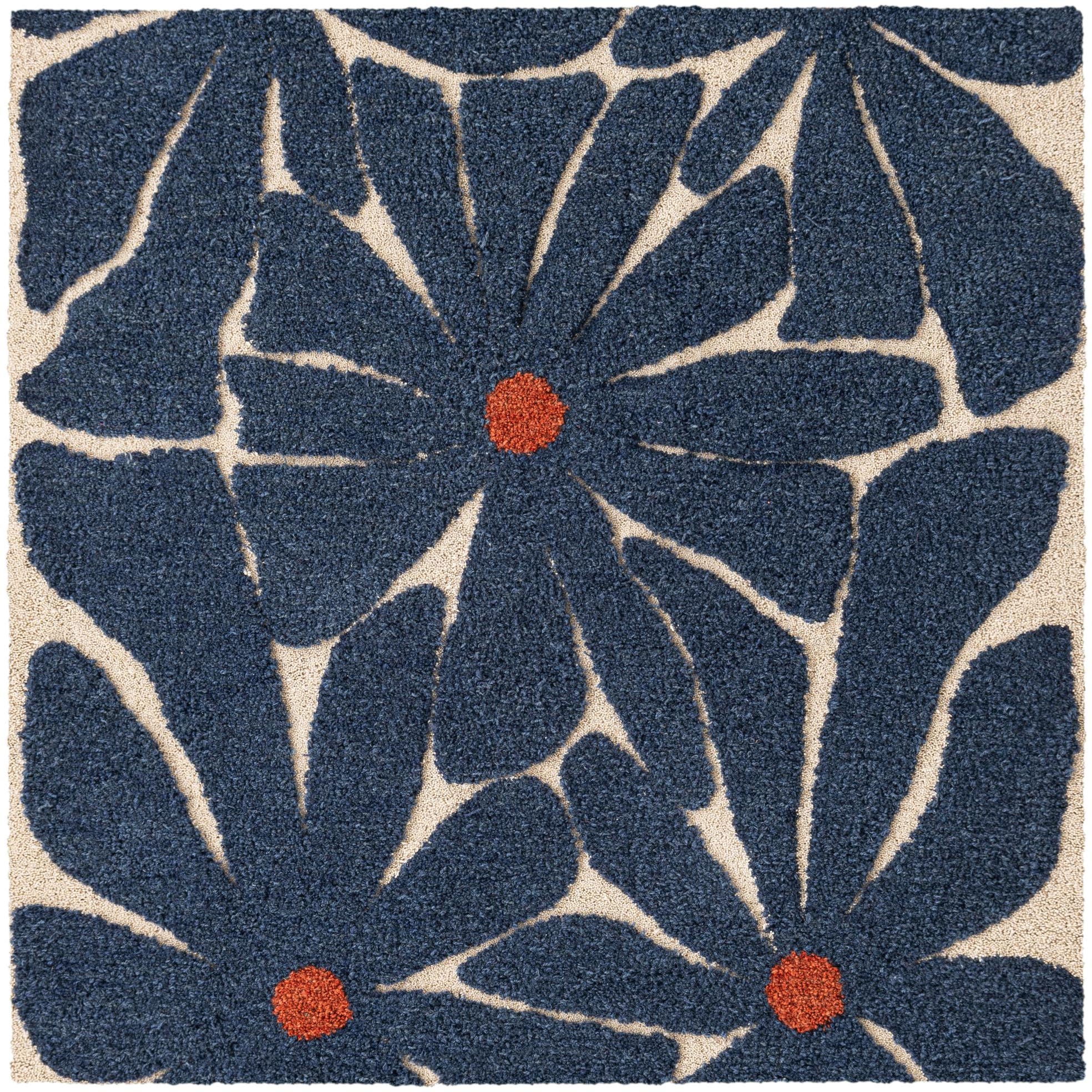 Hand-tufted from 100% wool, the surface is soft and dense underfoot; the navy petals sit slightly raised against the lower ivory ground, creating a subtle sculpted texture you can both see and feel. This rug works well in a casual living room beneath a coffee table, layered in a bedroom to add pattern and warmth, or placed in an entry or reading nook to make a confident design statement. Pair it with warm wood tones, crisp white linens, and metal accents in brass or matte black for a balanced, inviting look.