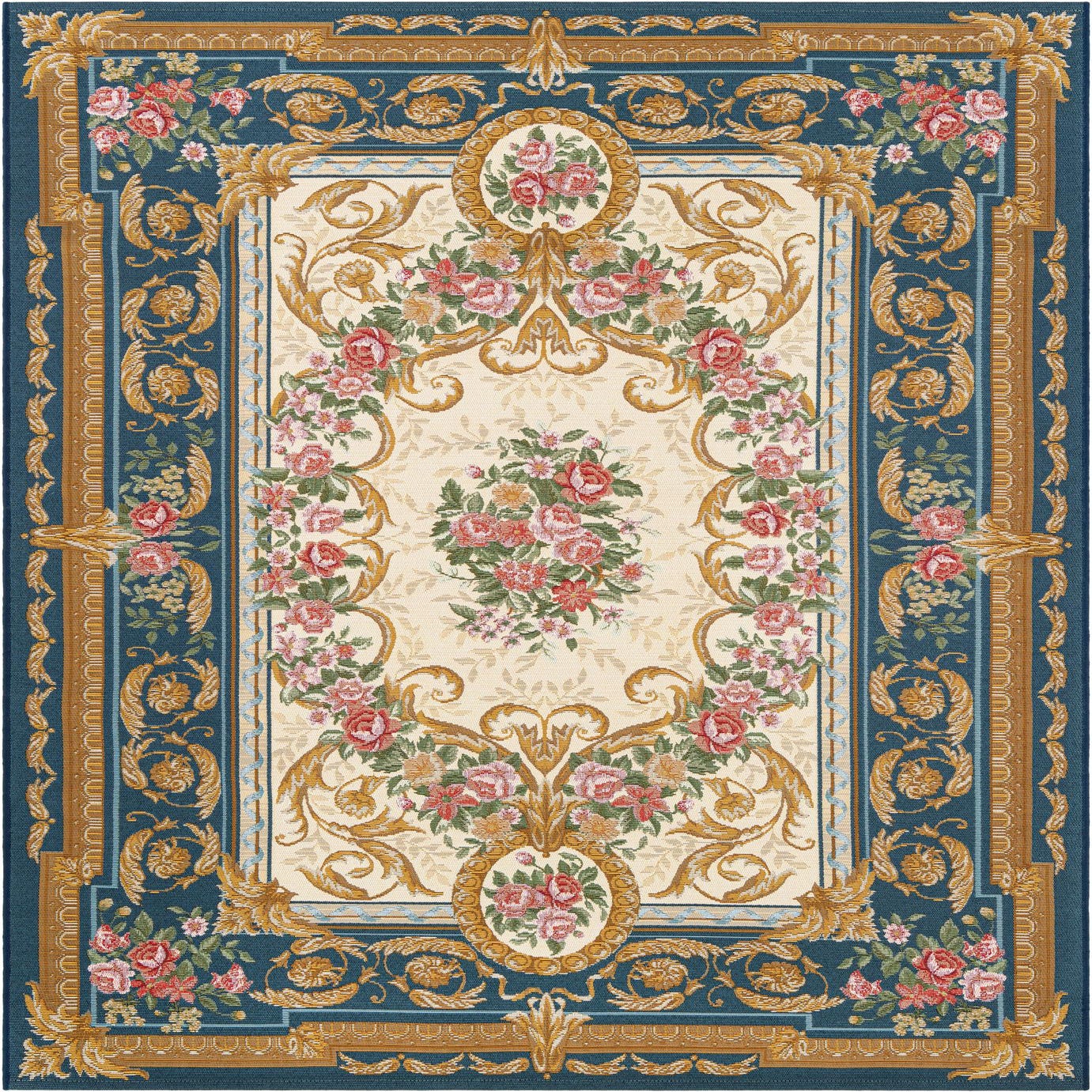 A rectangular 5x8 blue and ivory traditional rug with a central floral medallion and ornate gold scrollwork.