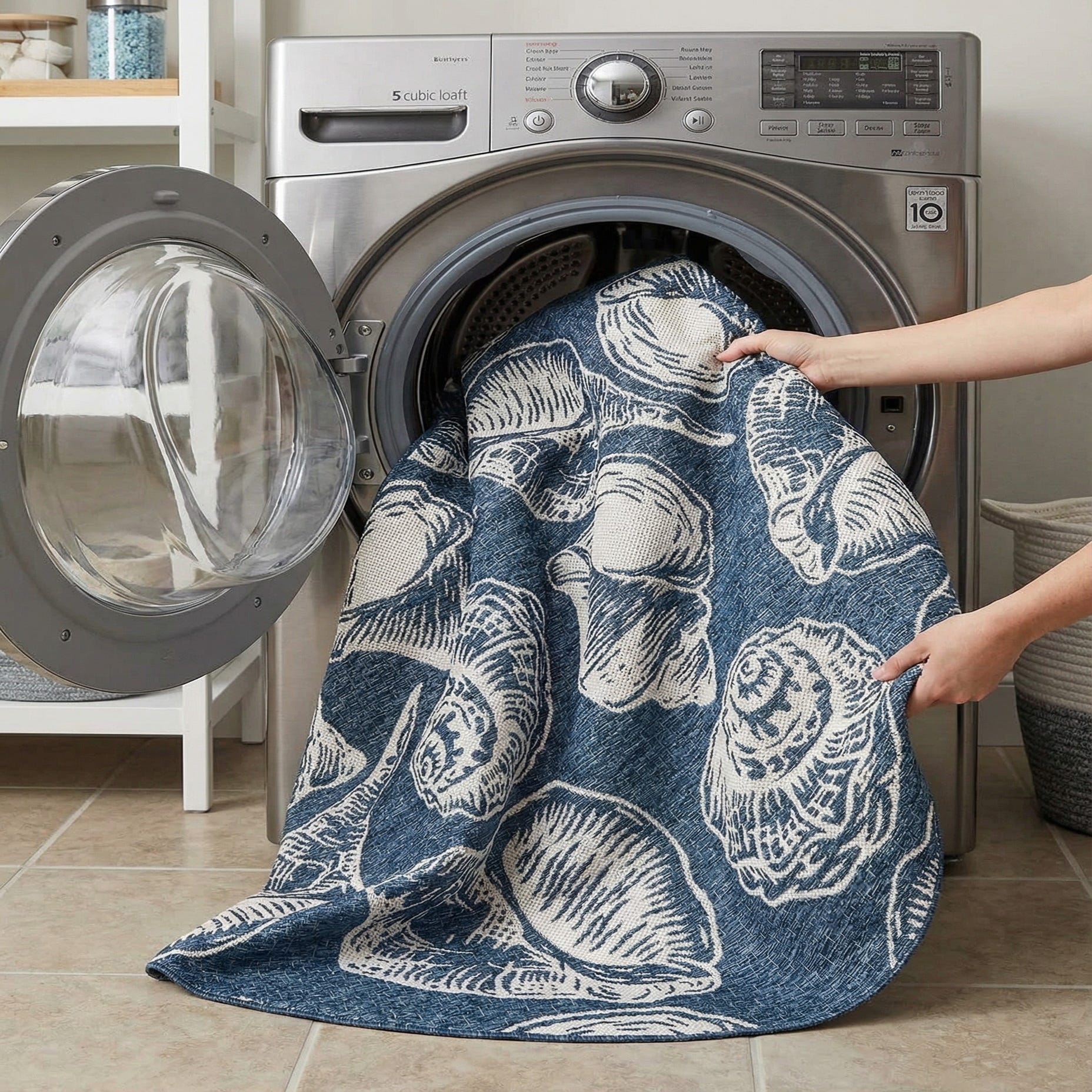 A hand-drawn shell pattern spills across a navy-blue field, the ivory shells rendered in fine, linear detail for a classic coastal look. The large-scale motif and generous negative space give the design room to breathe, while a subtly heathered navy background adds visual depth. Machine Made of 100% polypropylene, the rug has a low-profile, flat-woven texture that feels slightly textured underfoot and lays smoothly for indoor or outdoor living spaces.