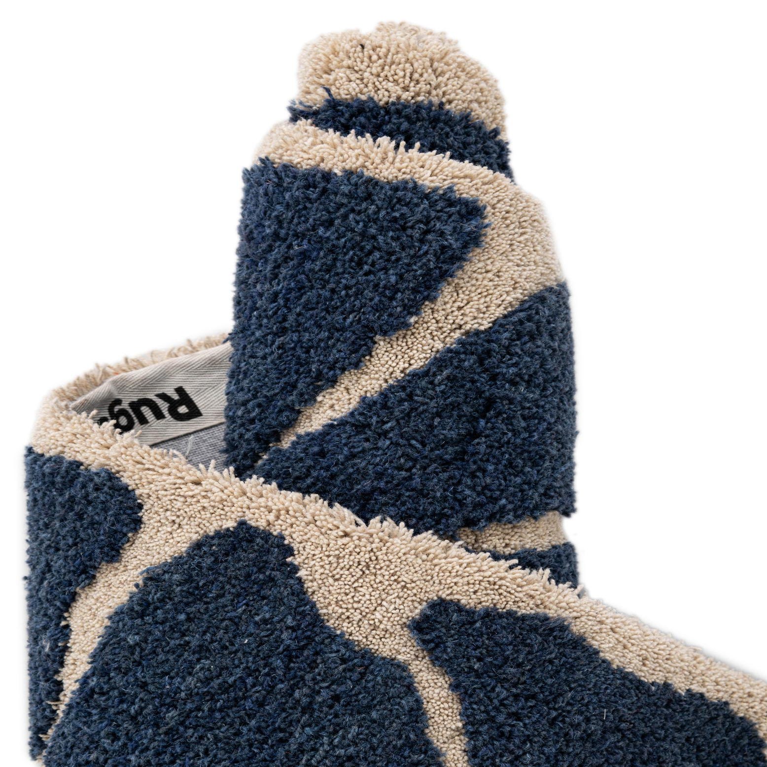 A close-up of a high-pile 8 ft runner rug featuring large, abstract blue floral shapes with orange centers on an ivory background.