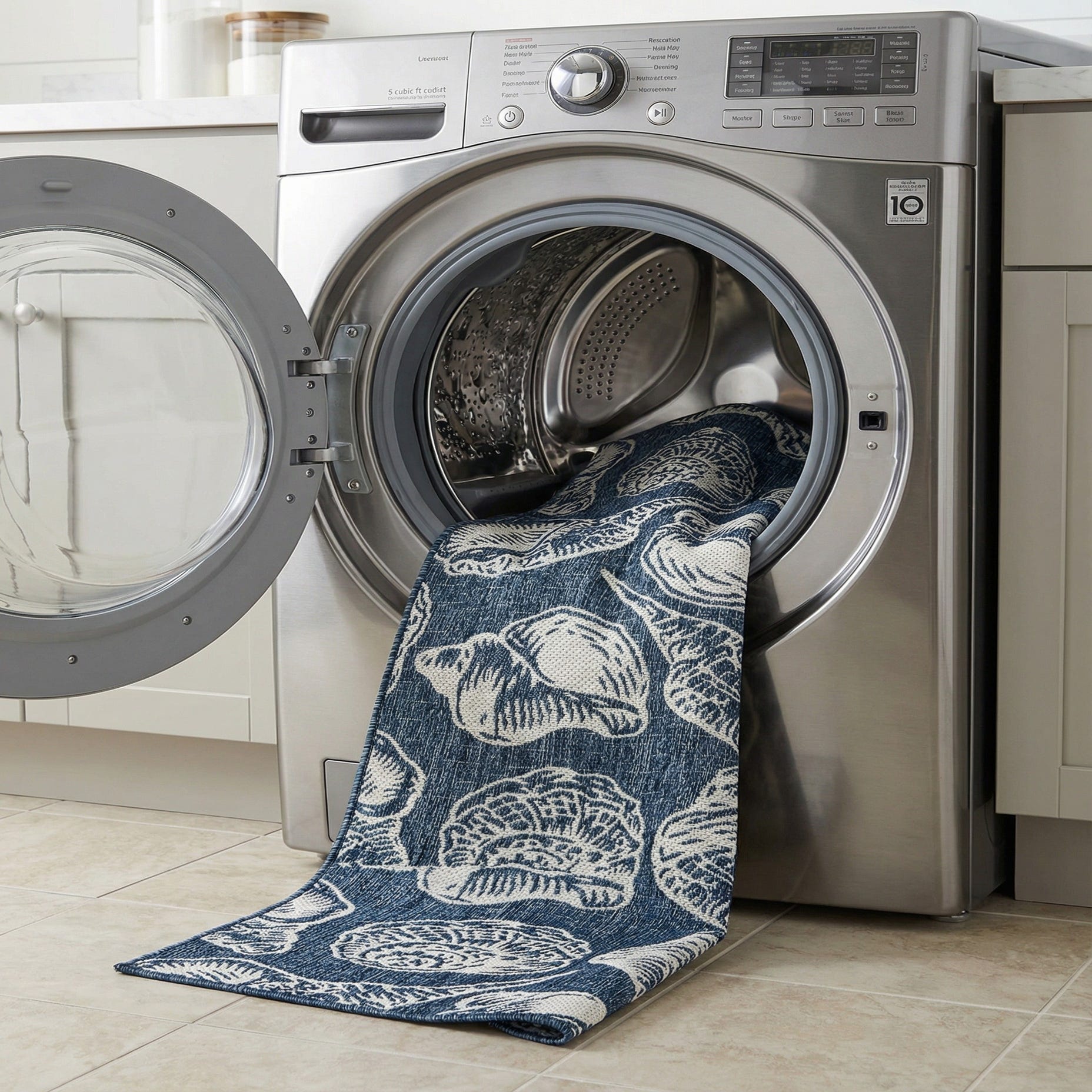 An 8 ft runner rug featuring a blue background with large ivory seashell and conch shell patterns, suitable for a coastal-themed hallway or patio.