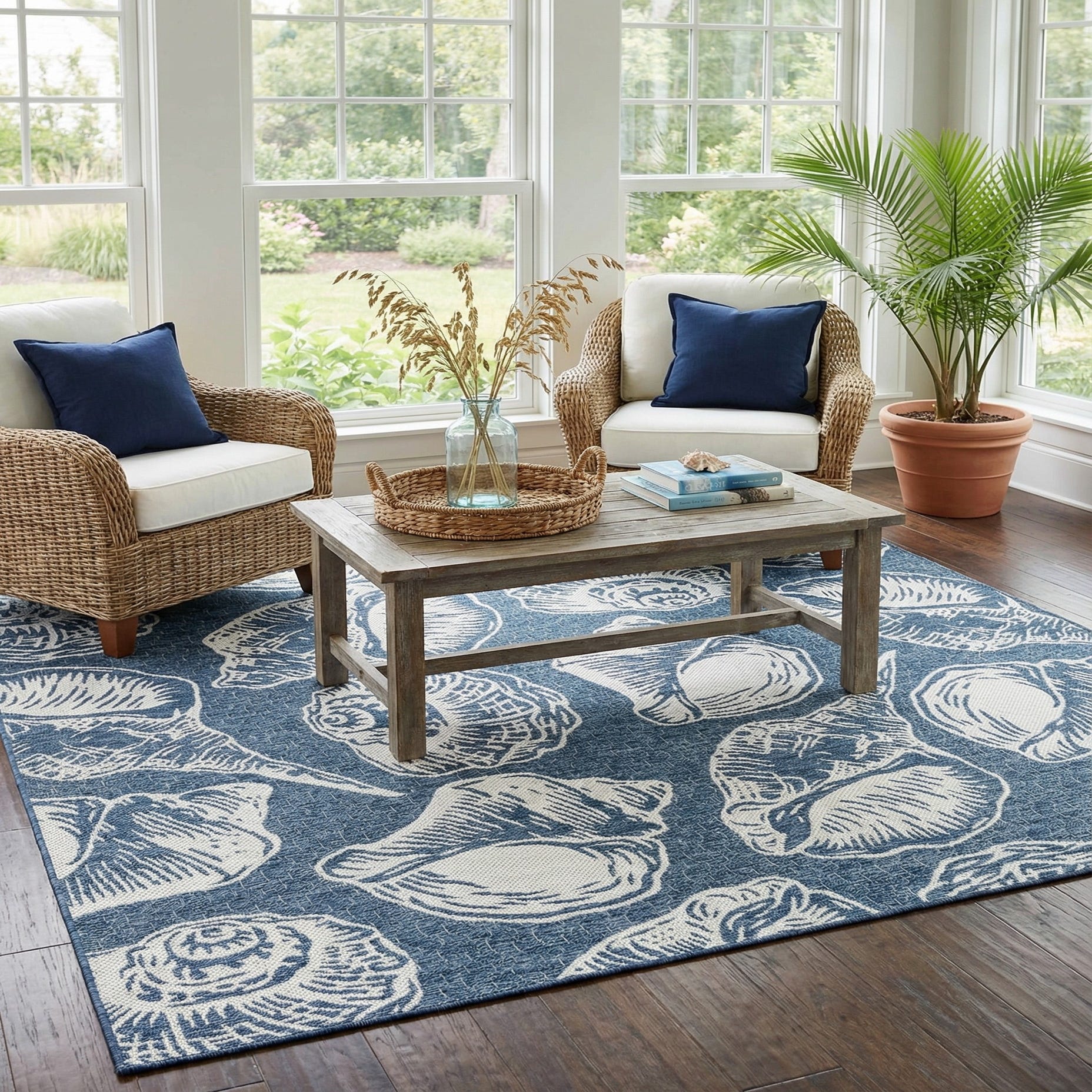A square 7' 10 x 7' 10 blue and ivory coastal rug featuring various seashell patterns, suitable for indoor or outdoor use.