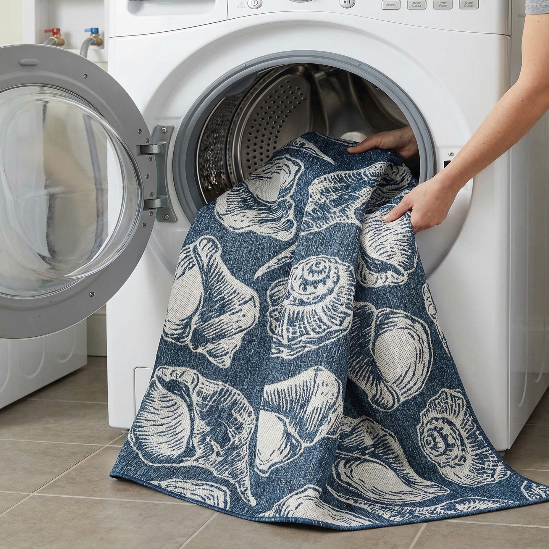 With its nautical theme, this rug is ideally suited for outdoor living spaces such as patios, decks, and porches, where it can complement wicker or rattan furniture. Its classic color palette and design allow it to integrate seamlessly into nautically themed rooms, sunrooms, and beach houses, providing a focal point that is both decorative and functional.