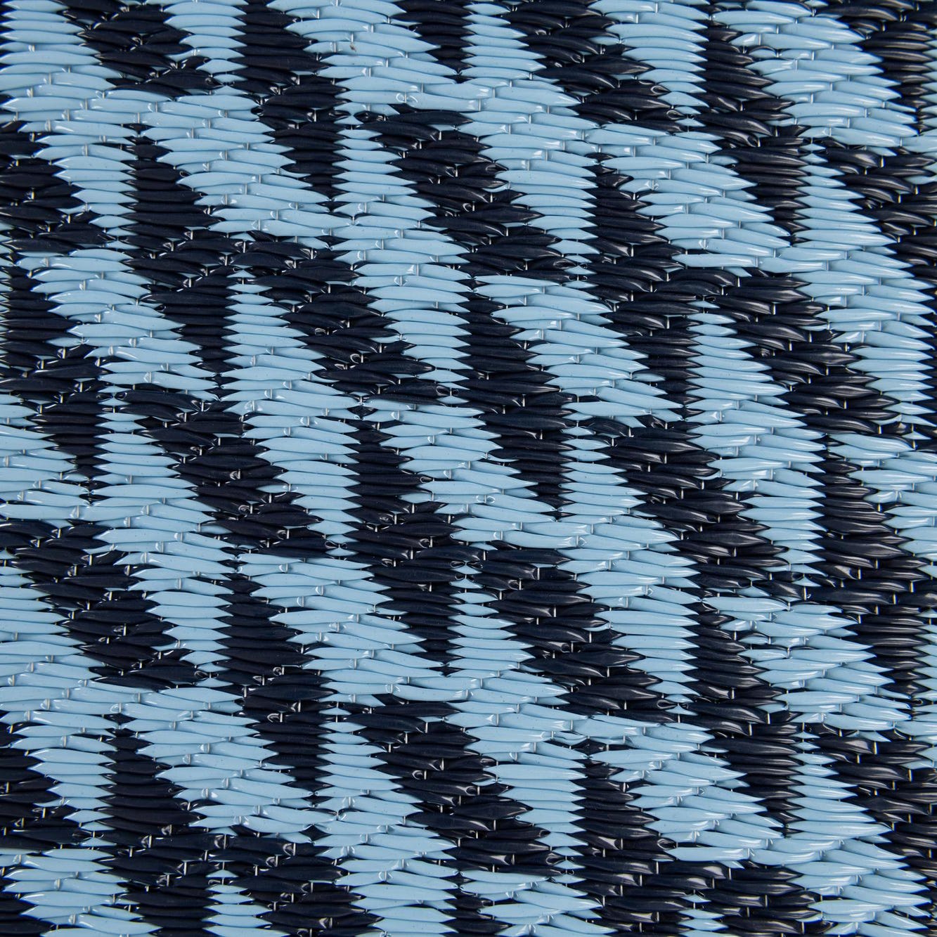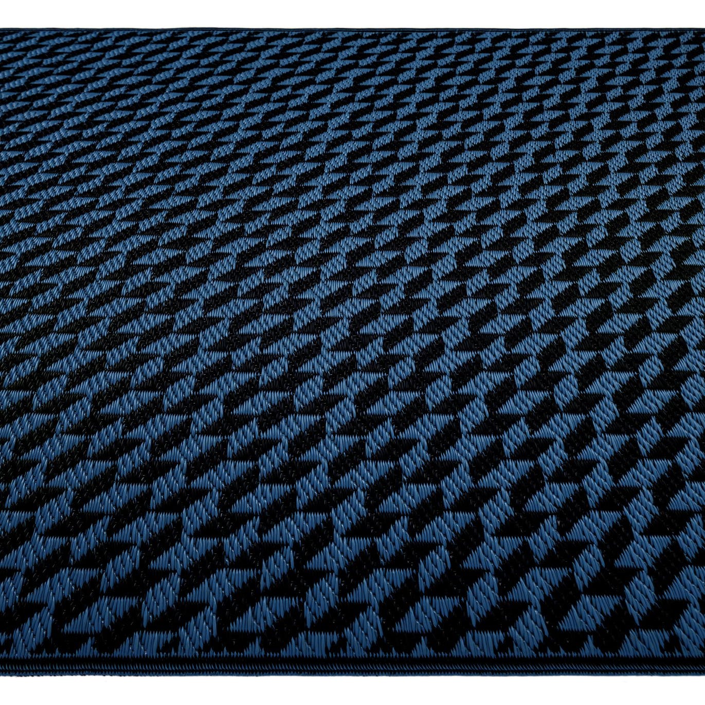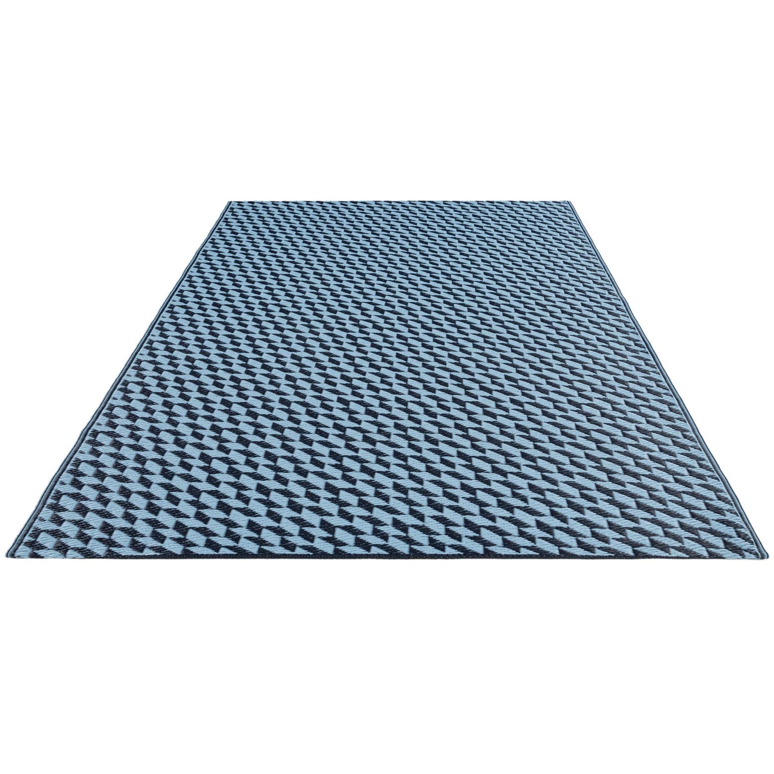 A 4x6 rectangular indoor/outdoor rug featuring a modern abstract pattern of interlocking navy blue and light blue geometric shapes.