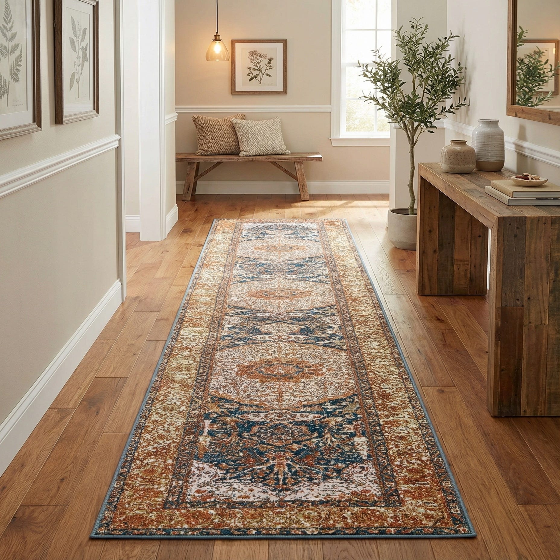 The runner’s long, narrow format is well suited to hallways, entryways, covered porches or sunrooms where you want pattern and color without bulk. Pair it with warm wood flooring and brass or gold accents to echo the metallic tones, use navy upholstery and ivory linens for a coordinated traditional look, or bring in soft blues and pinks for a transitional scheme that balances classic detail with contemporary color.