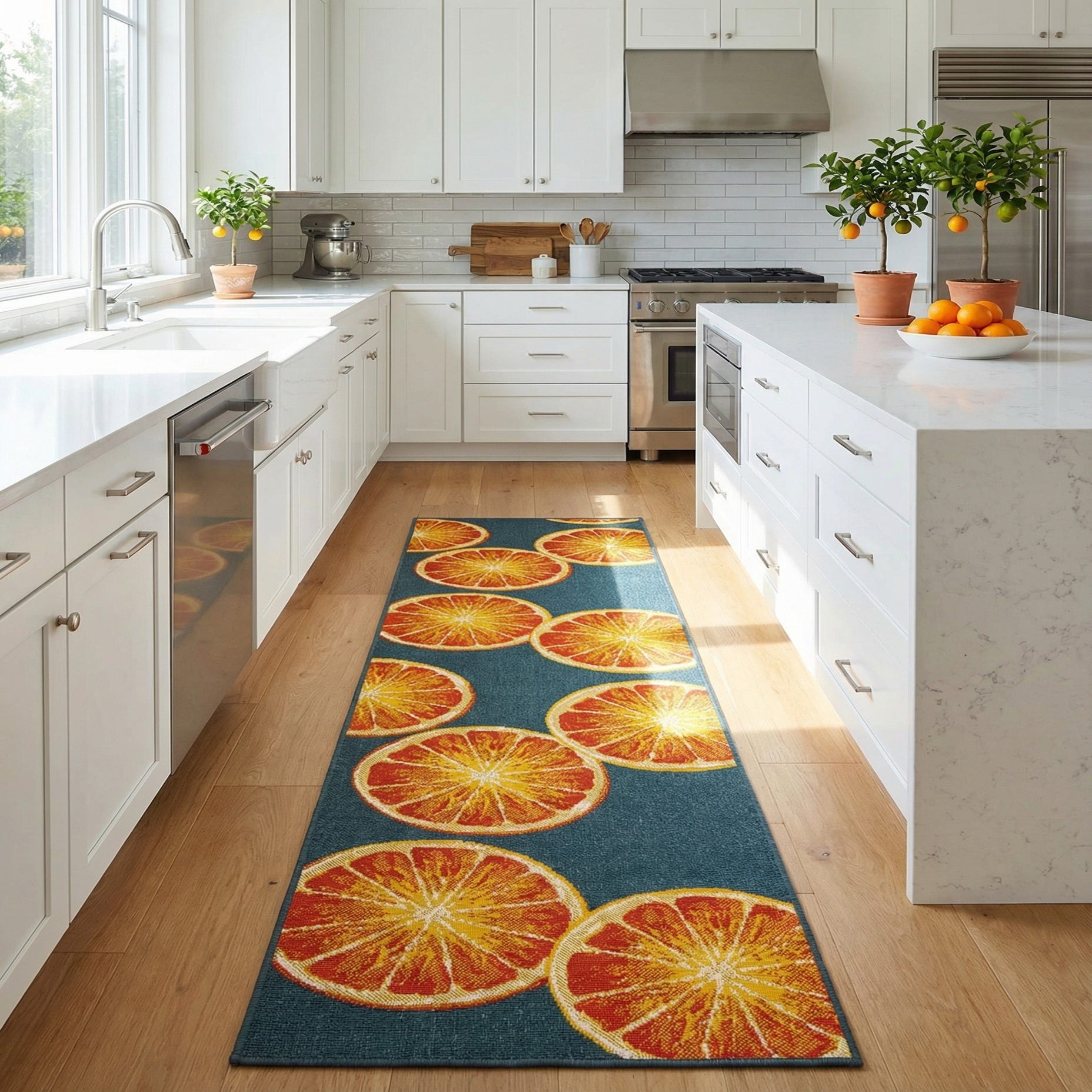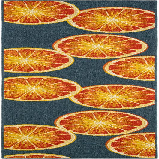 A 10 ft runner rug featuring a vibrant pattern of orange and yellow citrus slices against a navy blue background, ideal for a hallway or patio.
