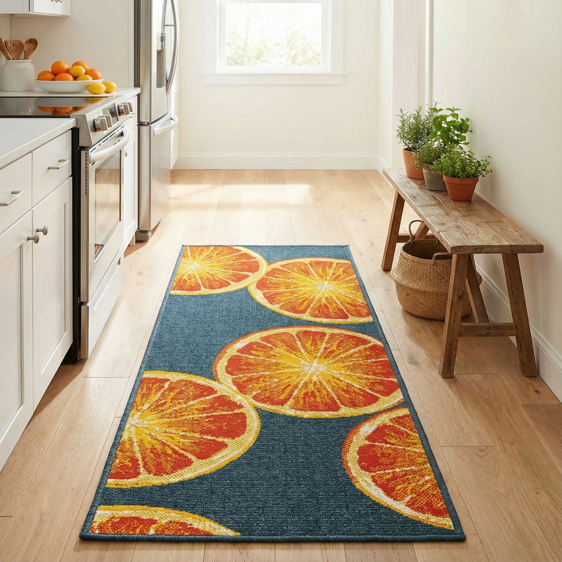 A 5 ft runner rug featuring a modern abstract pattern of large orange and yellow citrus slices on a navy blue background.