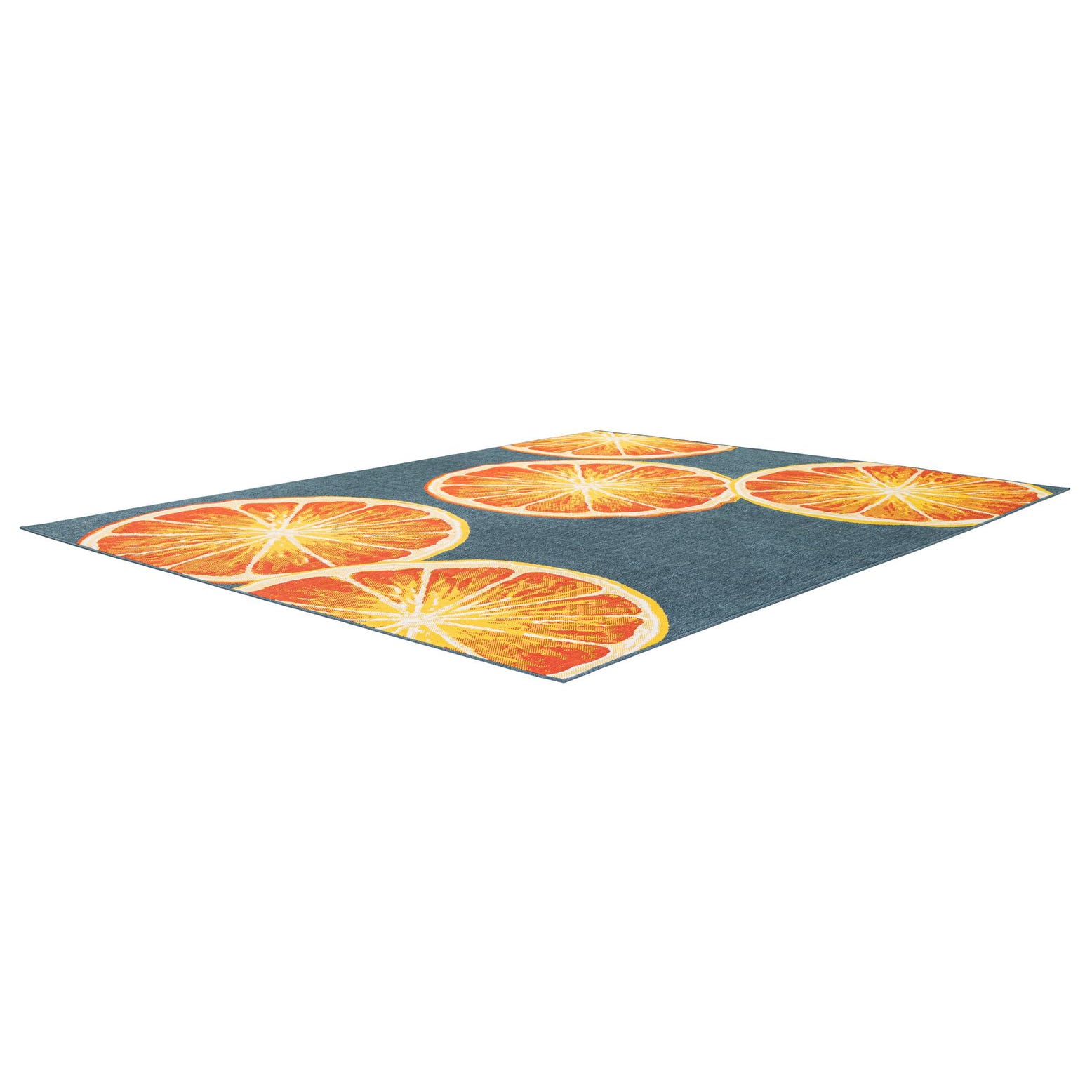 A navy blue 8x10 rectangular rug featuring large, vibrant orange and yellow citrus slice patterns, suitable for indoor or outdoor use.