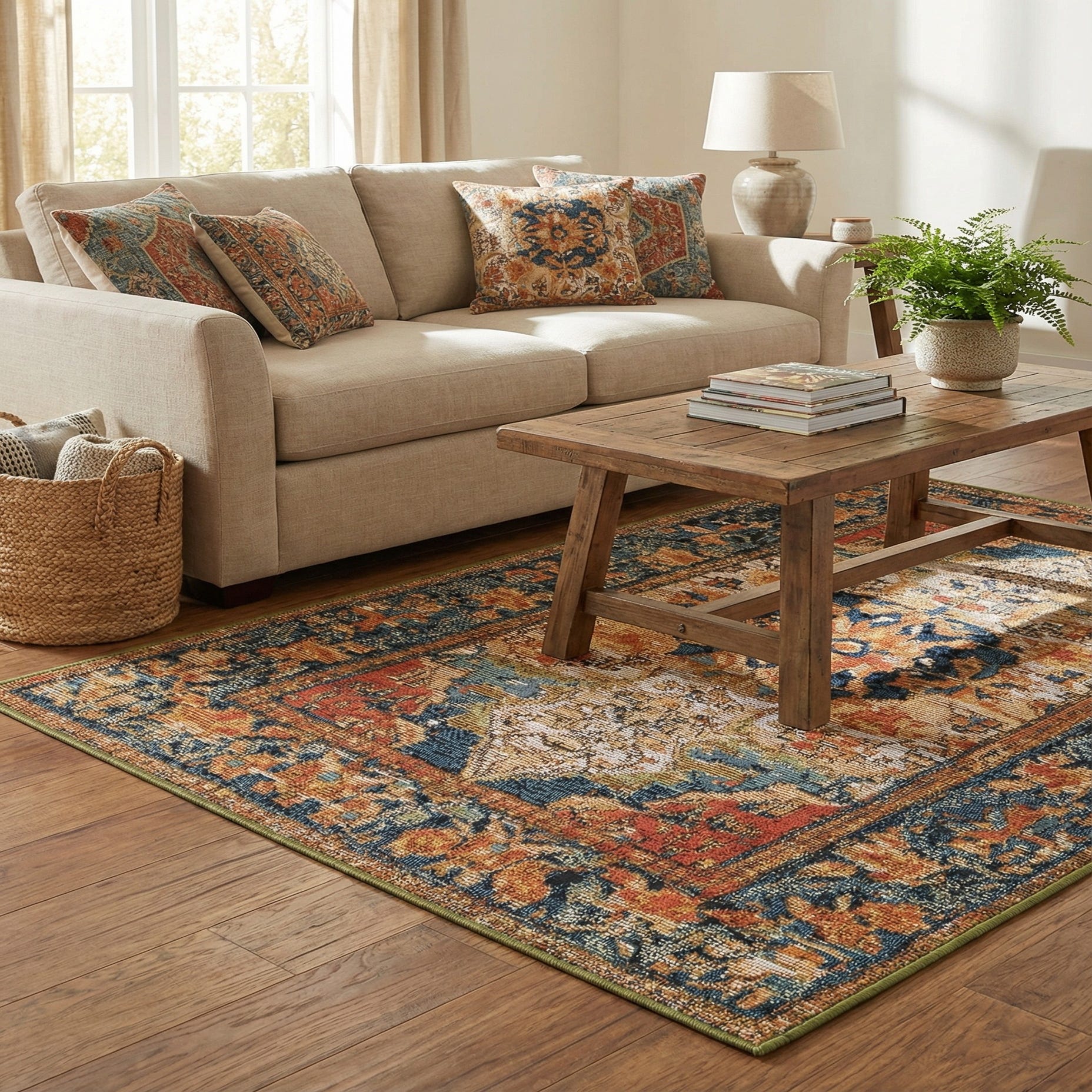 This piece works nicely as a small-scale accent in a covered porch or entry, layered at the foot of a daybed, or placed in front of a kitchen or powder room sink to add color and pattern without overpowering the space. Pair it with warm wood tones, leather or aged brass accents, and neutral linens for a relaxed traditional or transitional look, or combine with industrial metal and weathered furniture for a lived-in, collected feel.