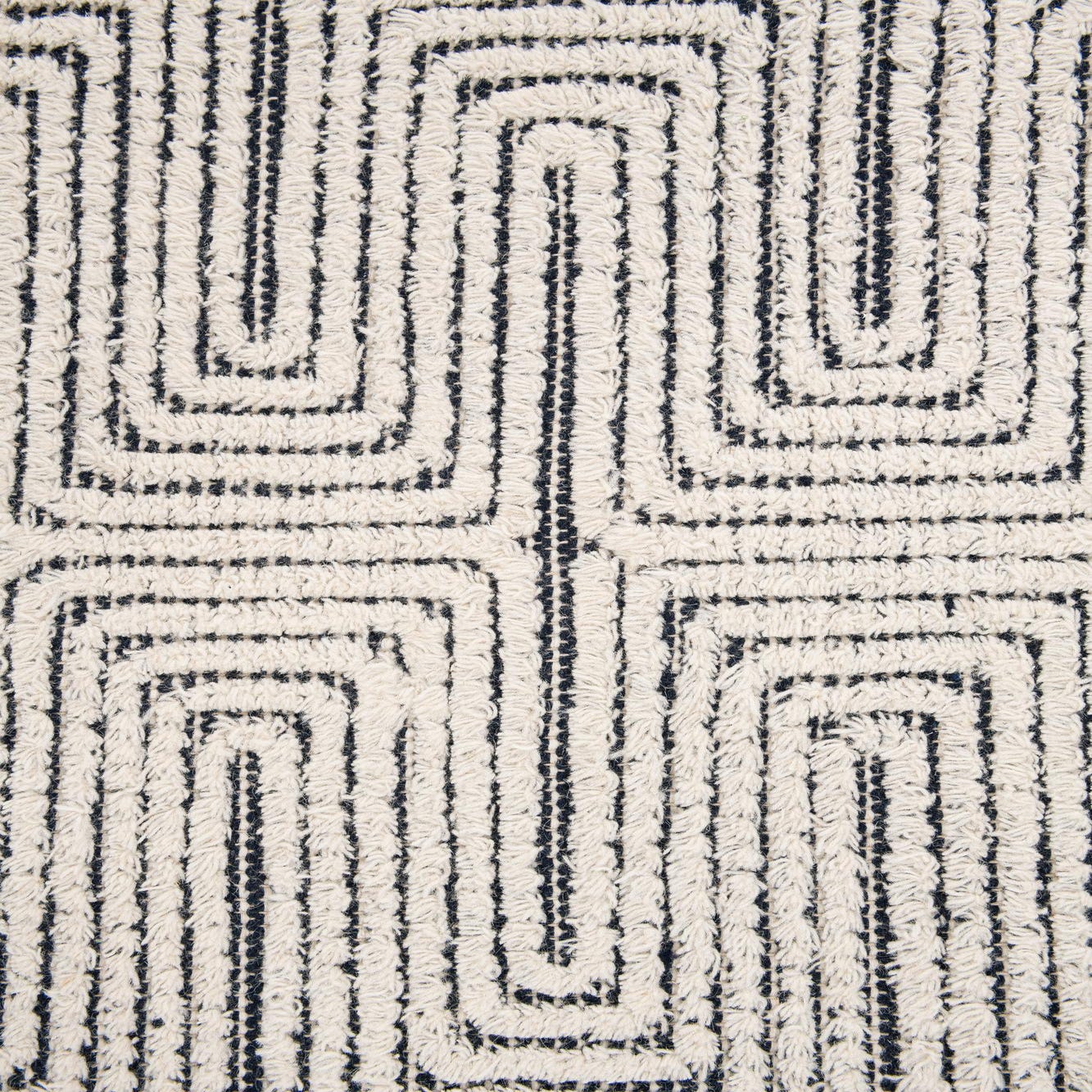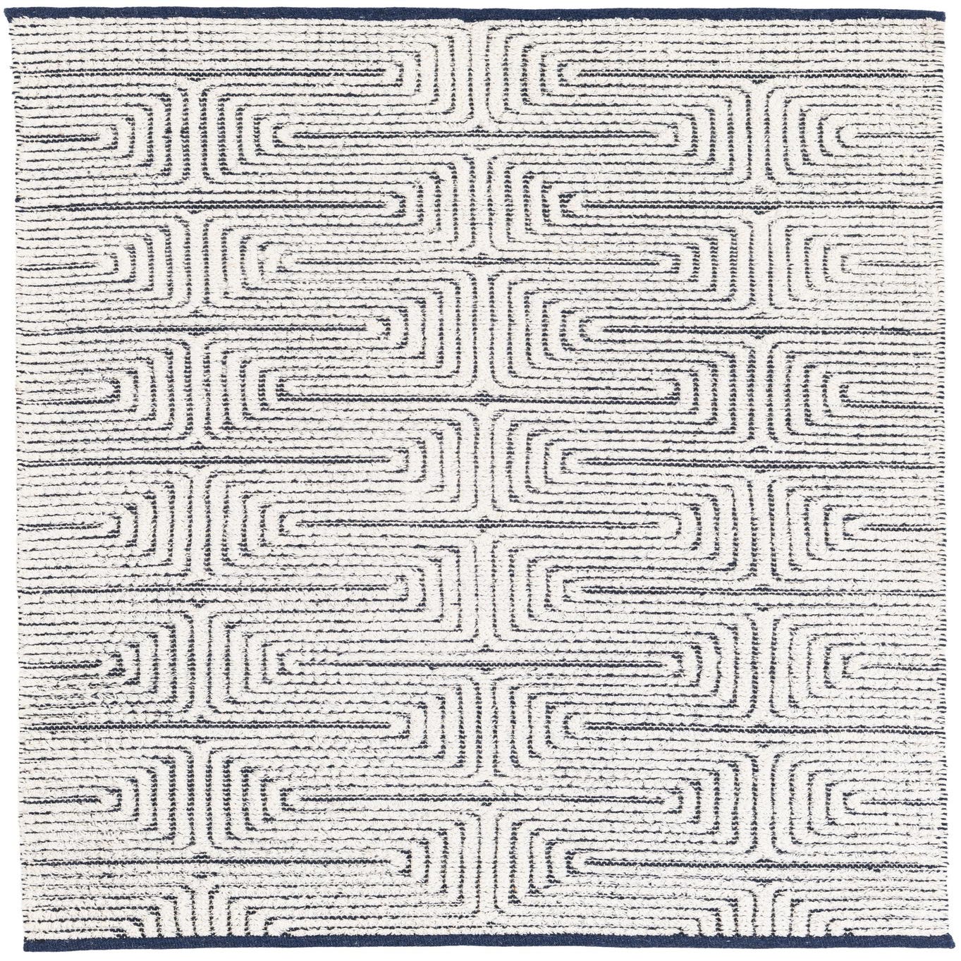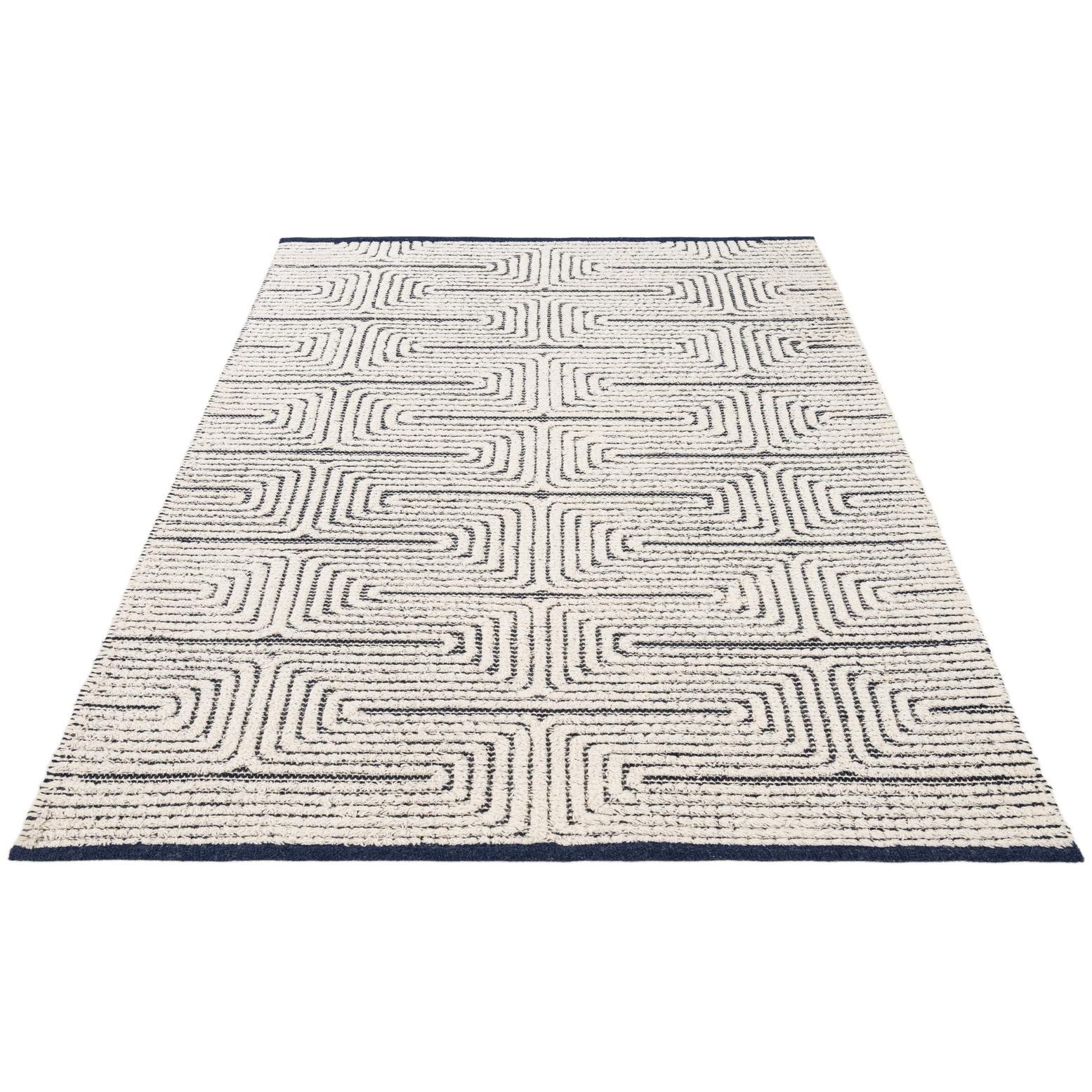 A 4x6 rectangular indoor rug featuring a modern geometric maze pattern in navy blue on a white background, with a solid navy border.