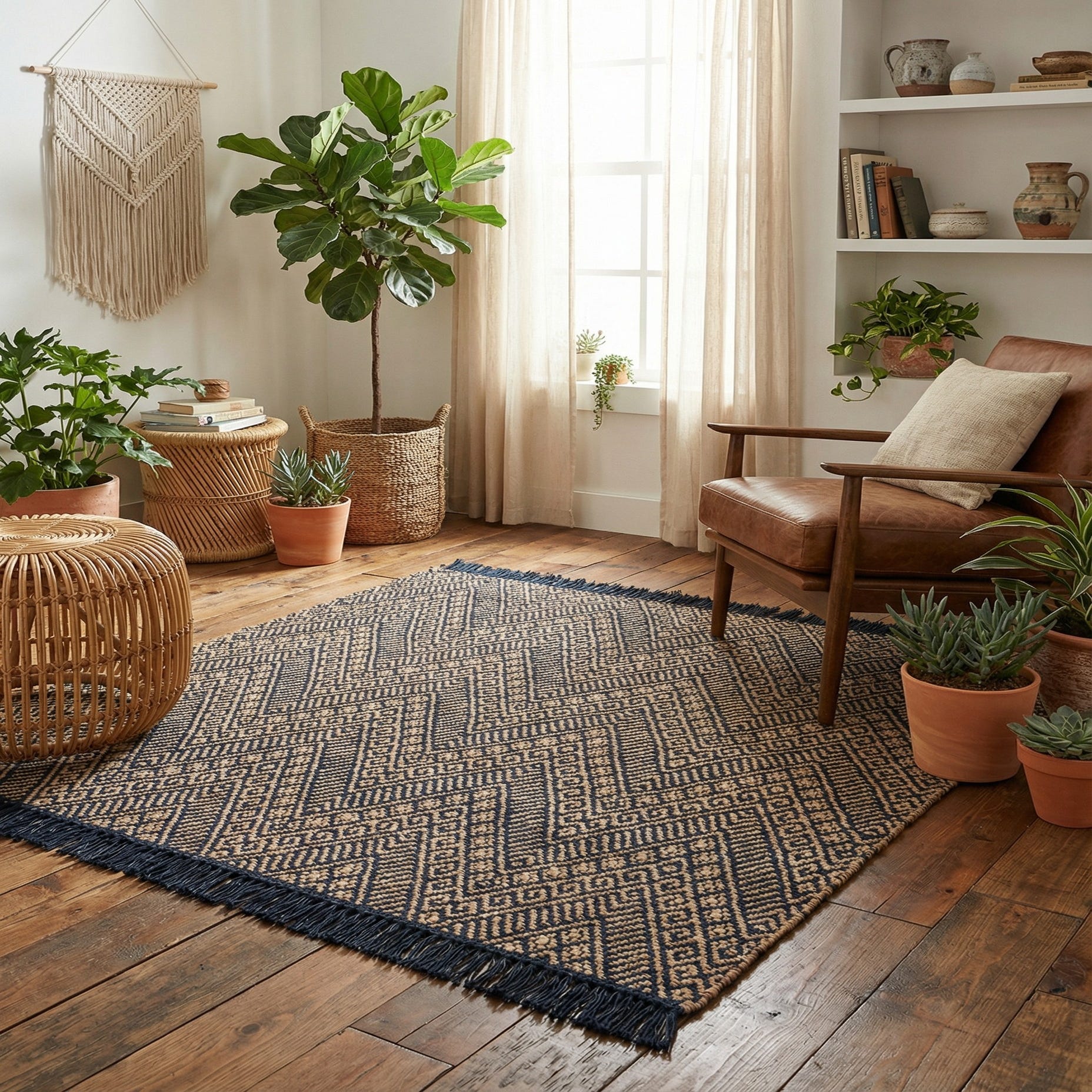 This rug works well in casual and coastal-inspired interiors as well as modern farmhouse or boho settings. Use it to anchor a living area or beneath a coffee table, place it in a foyer to define an entry, or layer it under a dining table in a relaxed breakfast nook. Pair it with light wood furniture, linen upholstery, and woven accents for a breezy look, or combine it with brass or matte black metal pieces and navy textiles for a more tailored scheme.