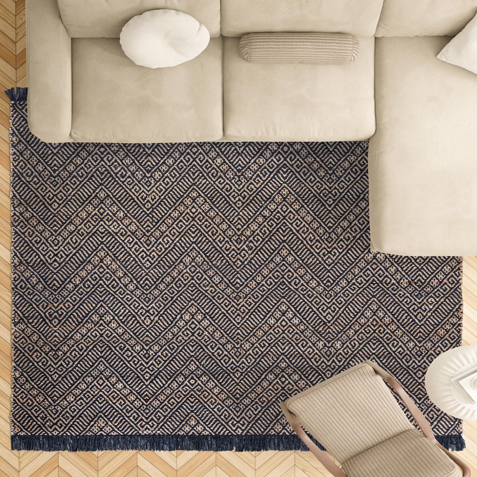 Hand-braided from 60% jute and 40% cotton, this flatweave rug combines a navy blue ground with a crisp white geometric pattern for a clean, graphic look. The design alternates broad chevron bands with smaller diamond and lattice motifs, creating layered visual texture that reads both structured and relaxed. Running fringes at the short ends add a casual finish, while the braided construction gives the surface a slightly nubby, tactile feel that’s sturdy underfoot but still comfortable to step on.