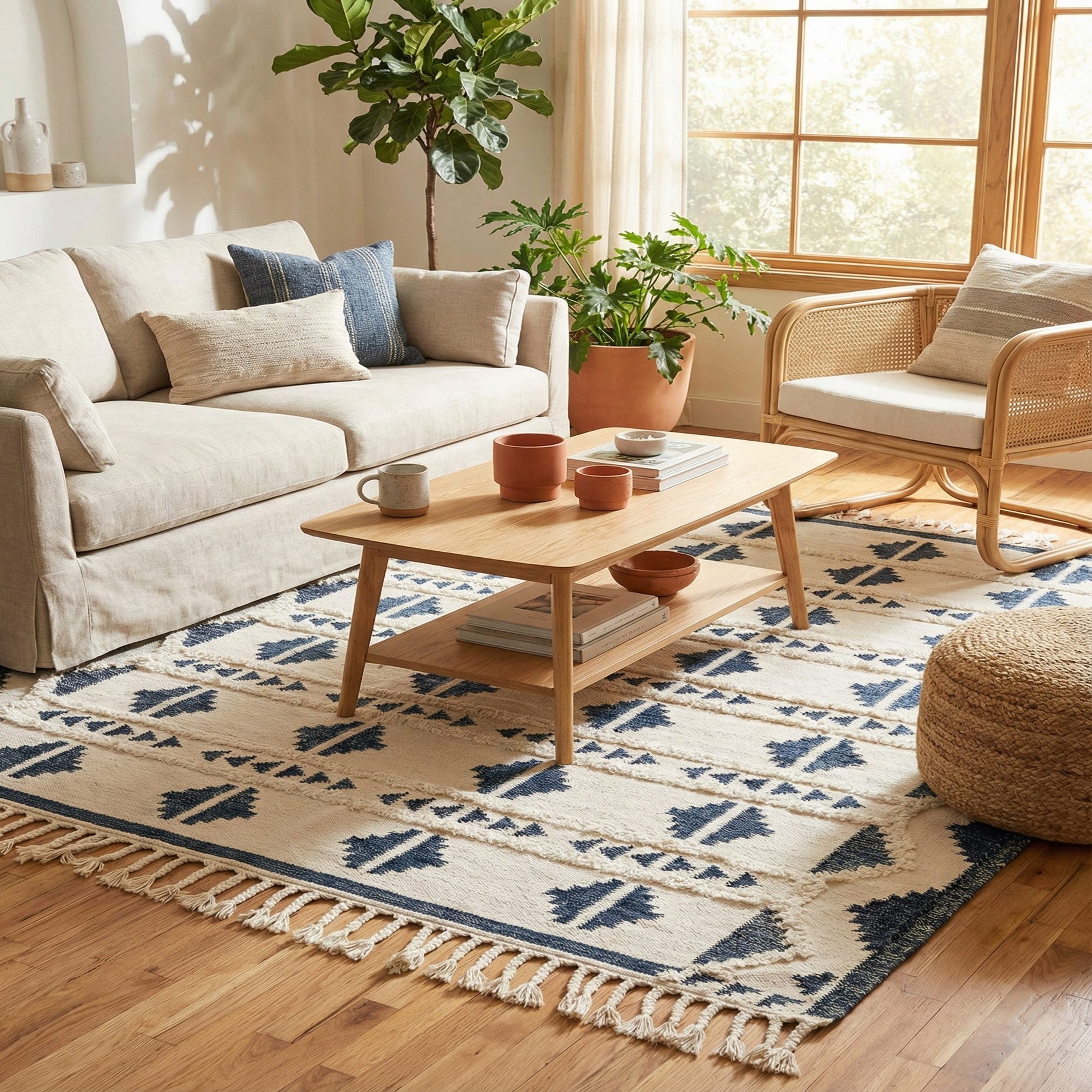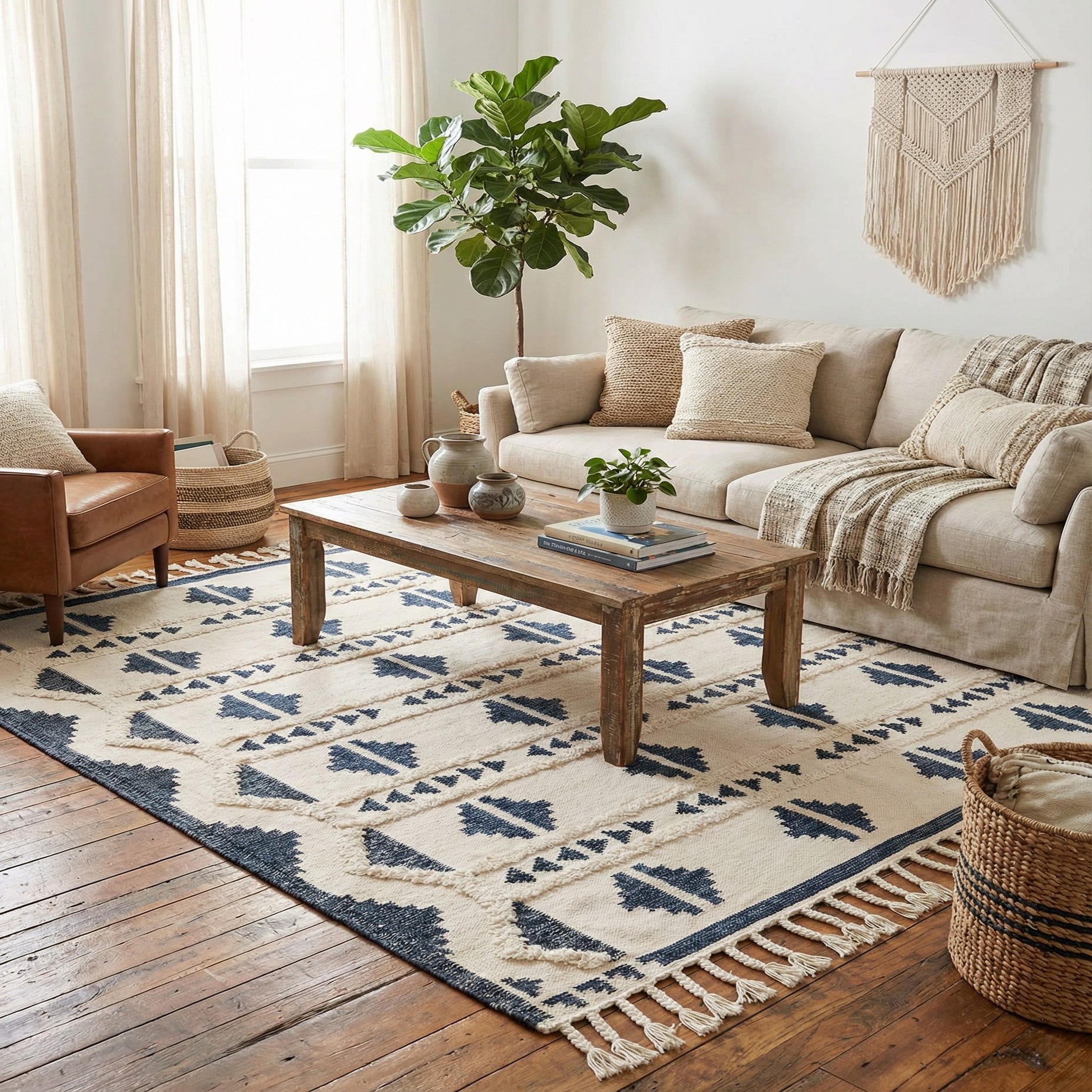This rug works well in casual living rooms or family rooms where you want pattern without heavy visual weight; it also complements modern farmhouse, coastal, or Southwestern-inspired interiors. Place it beneath a low coffee table to anchor seating, layer it over wide-plank hardwood for added warmth, or use it in a bedroom to bring a calming, graphic element to the space.