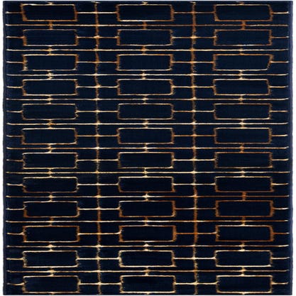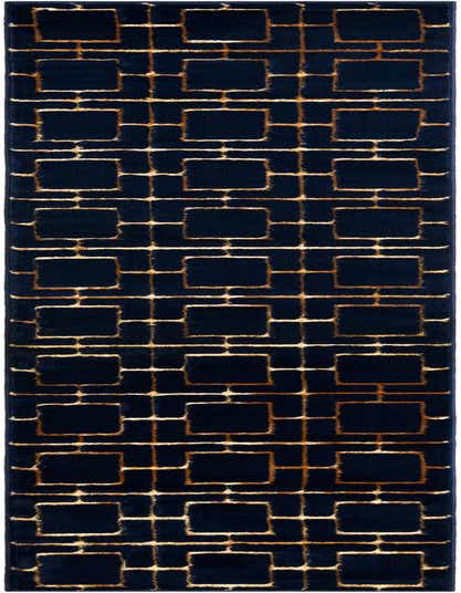 Deep navy background in Navy Blue Gold sets a rich stage for a structured trellis of warm Gold lines that form interlocking rectangular motifs. The geometric pattern reads modern and refined, with the gold areas catching light against the deep blue for subtle contrast. Machine-made from 70% polypropylene and 30% polyester, the pile has a soft, velvety hand underfoot with a slight sheen in the gold accents that adds dimension without overpowering the design.