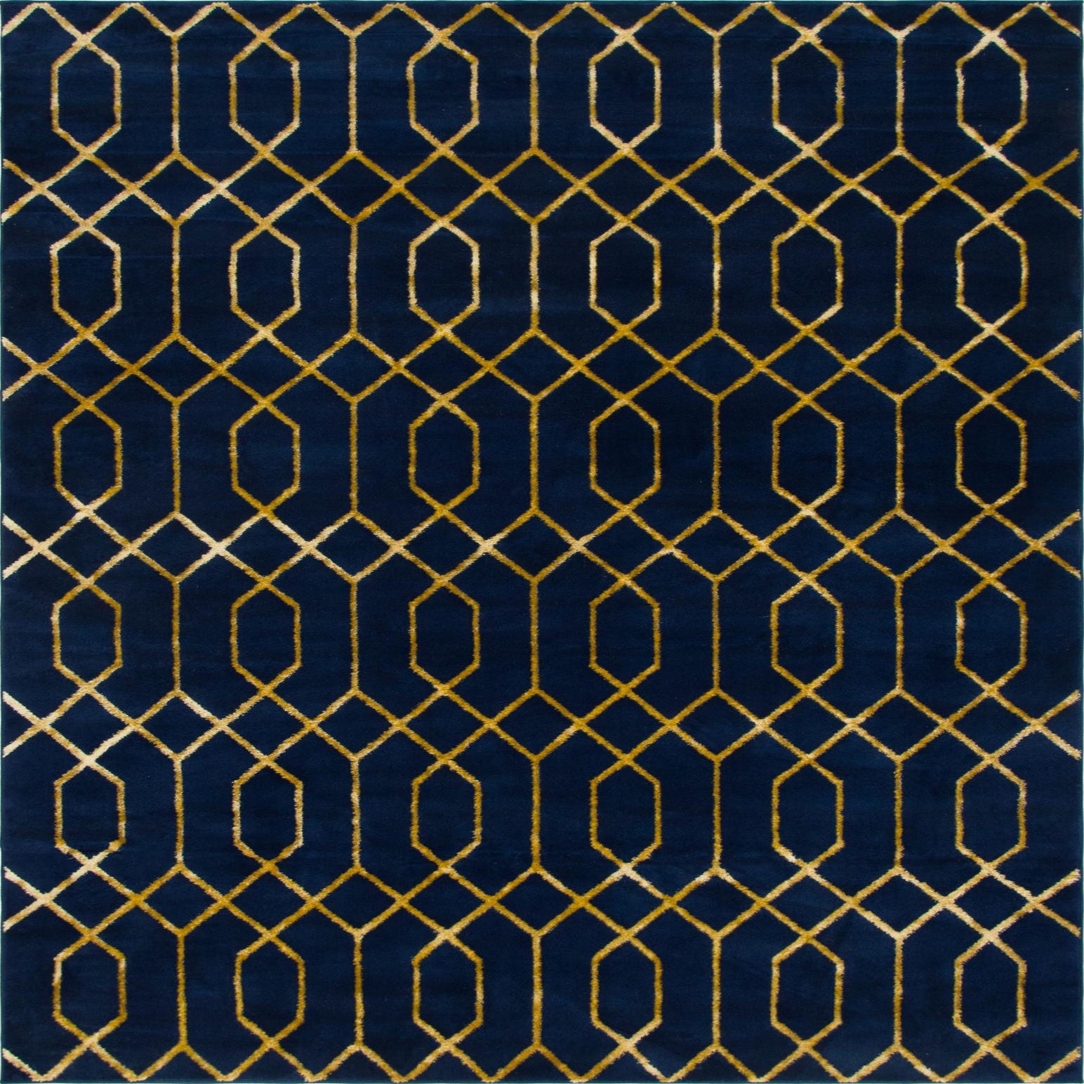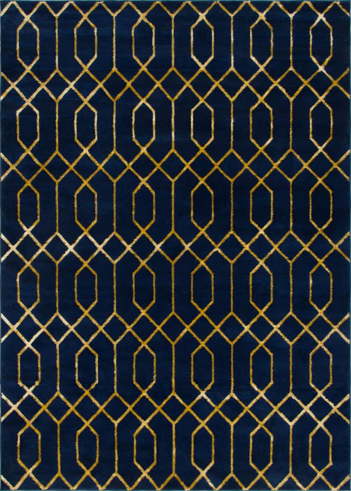 A bold geometric trellis lays across a deep navy-blue-gold field, the interlocking elongated hexagons rendered in warm gold tones that catch the light. The linear pattern reads modern-glam with a nod to classic latticework; the gold lines have a slightly raised, velvety texture against the low, dense pile of the background, creating gentle contrast both visually and to the touch. Machine made of 70% polypropylene and 30% polyester, the rug offers a soft, smooth hand with a subtle sheen that enhances the navy and gold palette without overpowering a room.