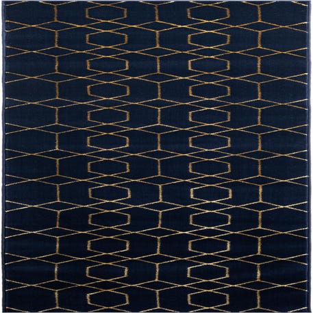 The glamorous navy and gold color palette and the lustrous sheen of the polyester threads lend this rug the versatility to complement a variety of decors, from contemporary to transitional. The elegant design would be particularly well-suited for enhancing hallways, elongated spaces, or as a sophisticated accent in a living room or home office. Its durable nature makes it a practical addition to spaces that blend aesthetics with functionality.