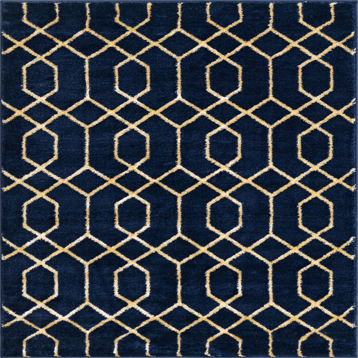 A deep Navy Blue Gold field sets the stage for a repeating geometric trellis in warm Gold, forming linked octagons and diamond motifs that bring modern structure to the design. Machine made from 70% polypropylene and 30% polyester, the rug has a dense cut pile: the navy area offers a low-sheen, velvety surface while the gold pattern sits slightly raised with a soft, plush texture you can feel underfoot. The contrast between the smooth navy ground and the textured gold lines adds visual depth without overpowering a room.