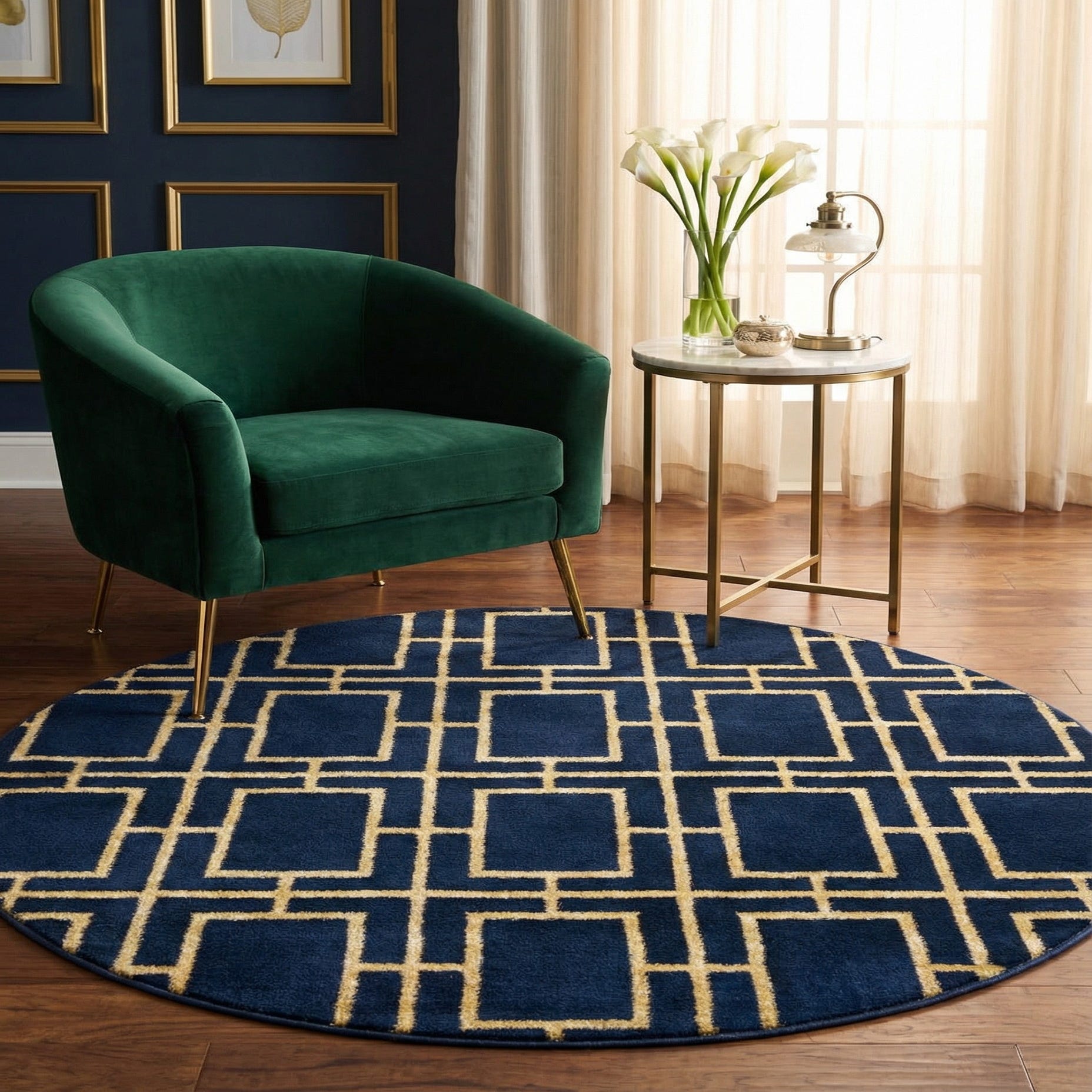 Machine made from 70% polypropylene and 30% polyester, the rug has a dense, soft surface with a slight sheen where the polyester highlights catch the light. The pile feels comfortable underfoot and recovers well from foot traffic. This round piece works beautifully anchoring a small seating area, beneath a bistro or breakfast table, or in a bedroom sitting nook. It pairs especially well with brass or gold metal finishes, navy or cream upholstery, and interiors that lean mid-century modern, contemporary, or transitional.