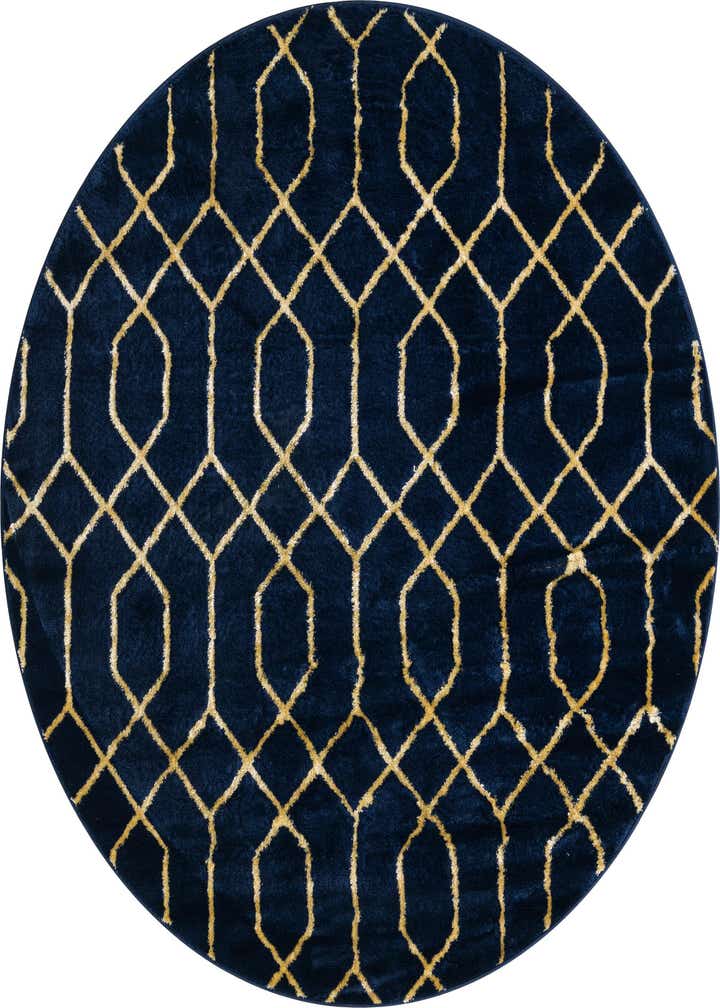 A round rug with a contemporary trellis pattern formed by interlocking elongated hexagons and diamond shapes in a warm gold against a deep navy field. Background color is Navy Blue Gold. The gold motif has a slightly textured, hand-drawn appearance that lifts from the pile, while the dense, velvety cut pile feels soft and plush underfoot with a gentle sheen that catches the light. Machine made of 70% polypropylene and 30% polyester, this rug combines a luxurious touch with easy-to-layer construction.