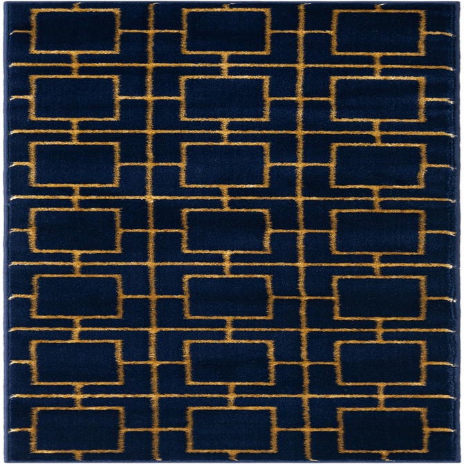 A bold geometric trellis of gold rectangles sits on a rich navy field, forming an orderly grid that reads modern with a nod to classic glamour. The gold motif has a slight sheen and a raised cut-pile feel that contrasts with the velvety, dense navy background, giving the surface visual depth and a tactile interplay between the two fibers. Clean lines and repeating rectangular forms create a structured, contemporary pattern that complements both minimalist and decorated interiors.