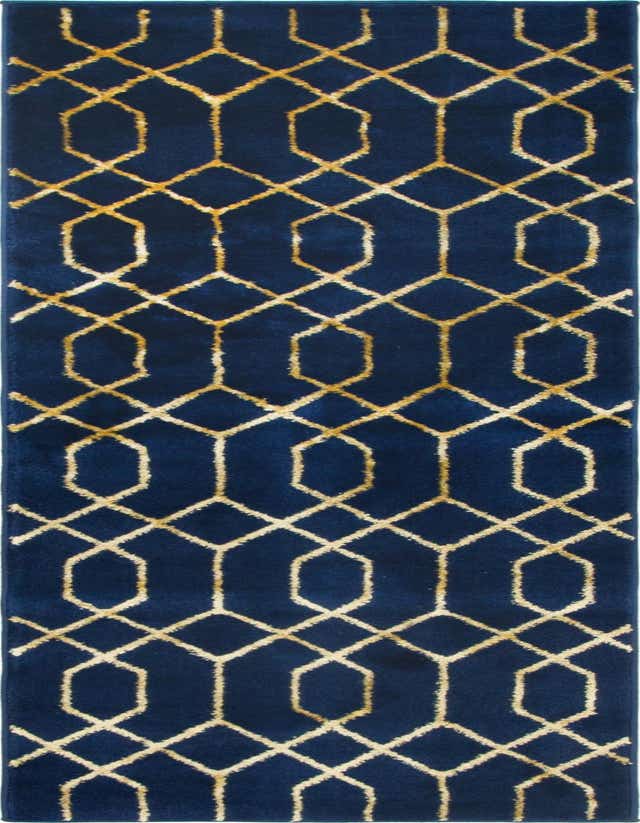 A deep Navy Blue Gold ground provides a rich backdrop for a repeating geometric trellis in warm Gold. The pattern pairs elongated octagonal motifs with diamond links to create a modern lattice that gives movement without overwhelming a space. The surface feels soft and slightly plush underfoot, with polyester fibers lending a subtle sheen that highlights the gold lines against the darker field.