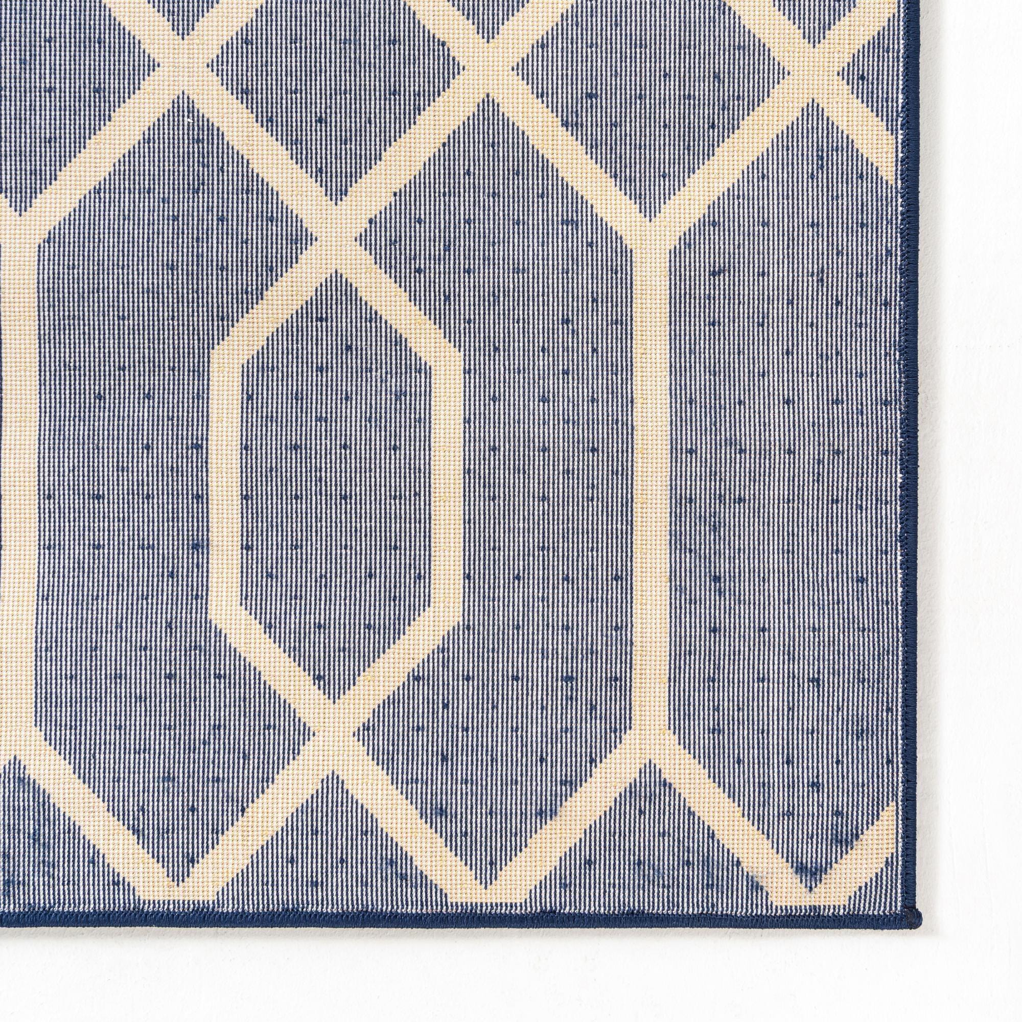 A 6 ft runner rug featuring a modern Hollywood Glam trellis pattern in deep blue with shimmering gold lines, ideal for a hallway.