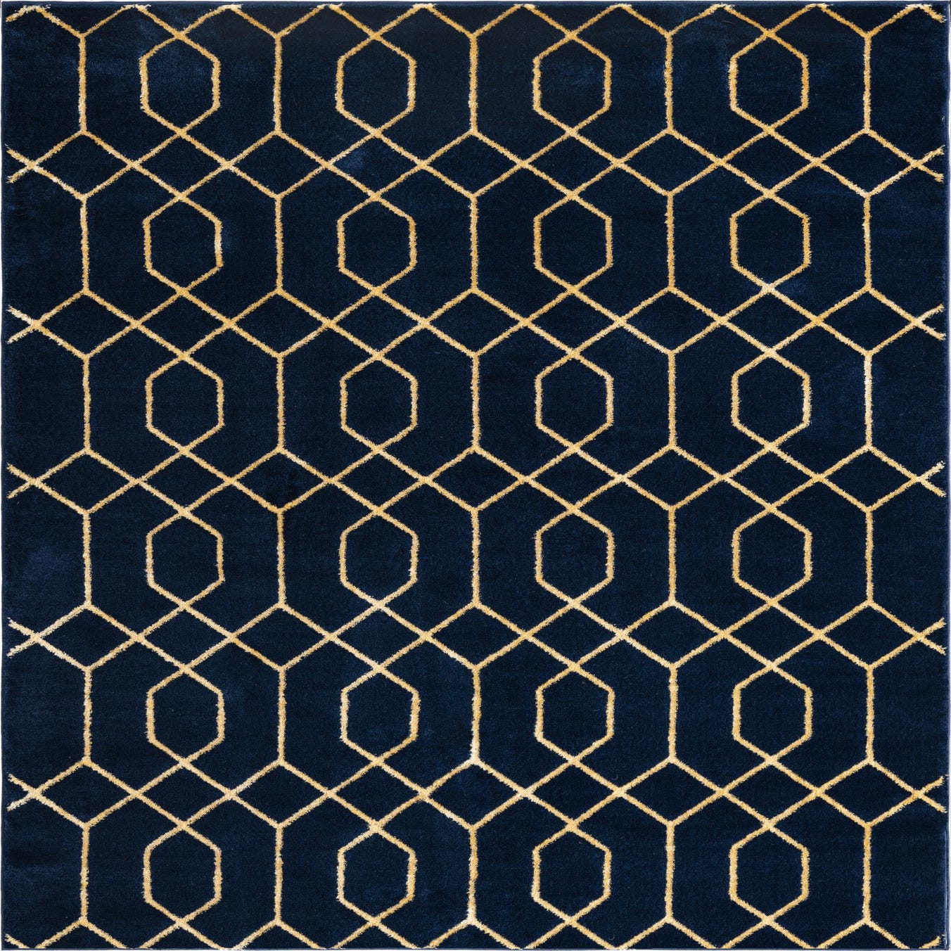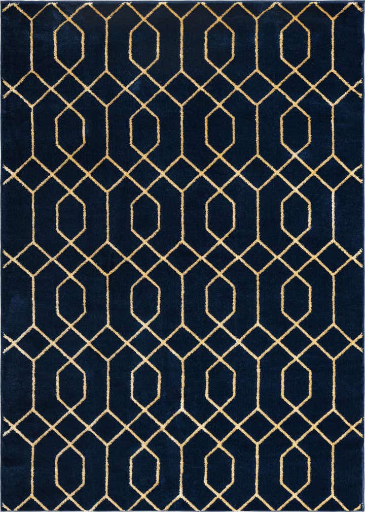 A deep Navy Blue Gold field provides a rich backdrop for a crisp Gold geometric trellis. The pattern alternates elongated octagons and connected diamond motifs to create a modern, structured repeat that reads clean and balanced across the surface. Machine made from 70% polypropylene and 30% polyester, the rug has a low-to-medium pile with a soft, slightly velvety hand and a gentle sheen from the polyester fibers, giving the gold lines a subtle luminous quality against the darker ground.