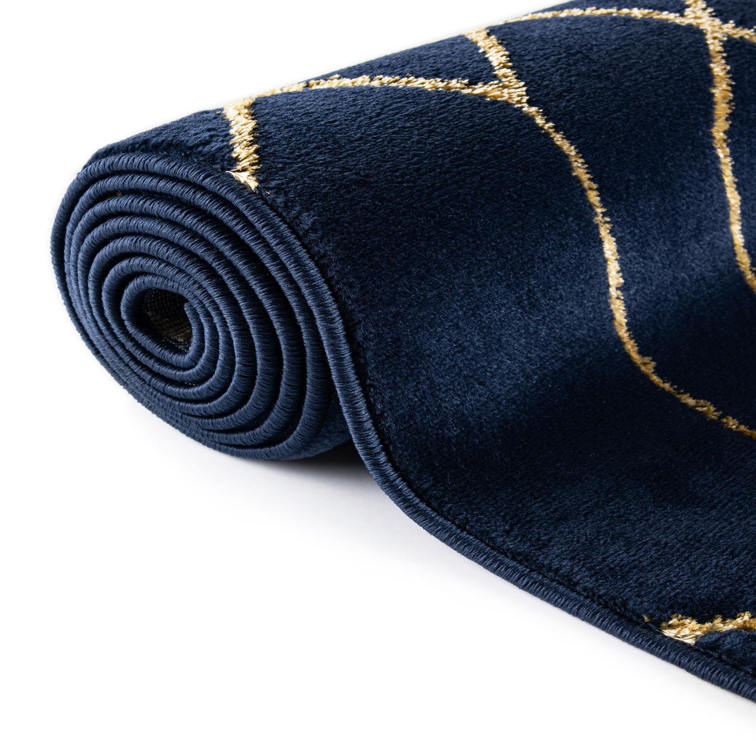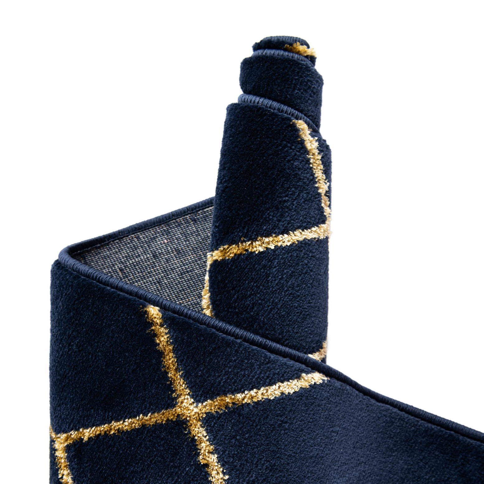 This rug works well as a living room anchor beneath a sofa and coffee table, layered under a dining table, or placed in a bedroom to add a touch of structured elegance. It complements brass or gold-toned accents, velvet upholstery, and mid-century or contemporary furnishings, and provides a striking contrast on light wood or neutral flooring. The navy-and-gold palette is versatile enough for a glam-inspired scheme or a more restrained, modern space.