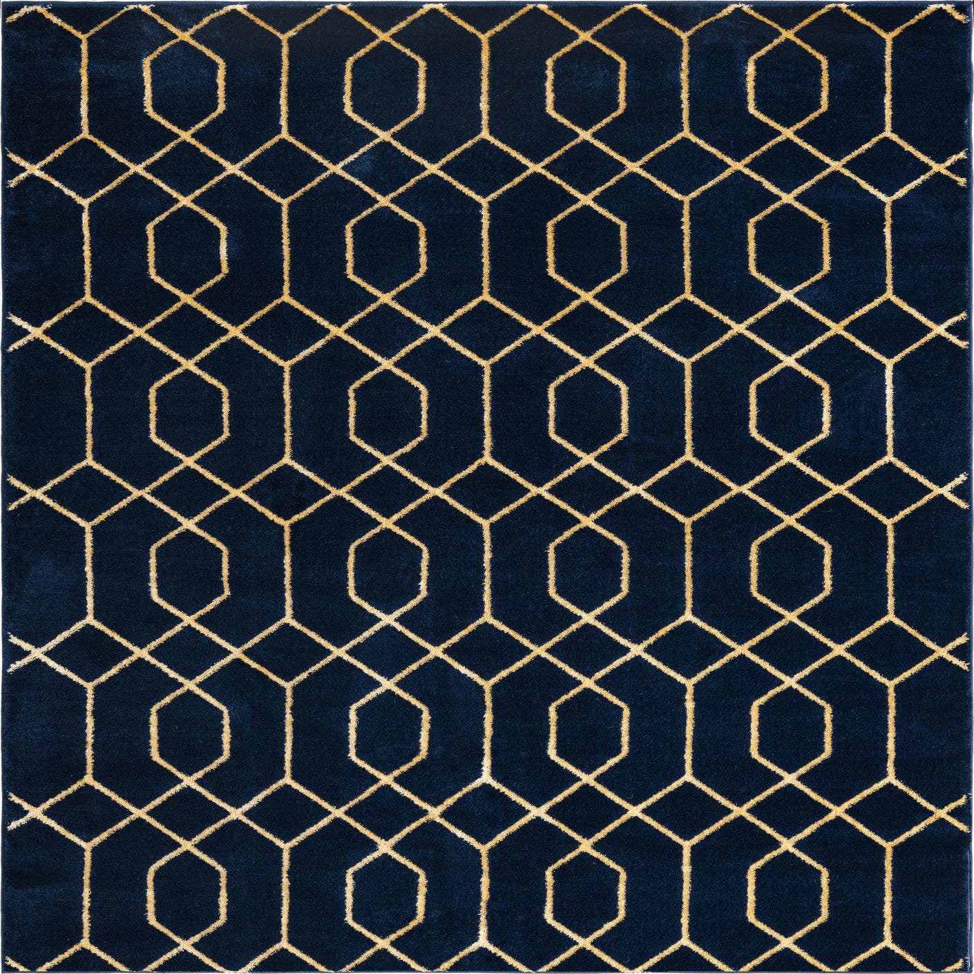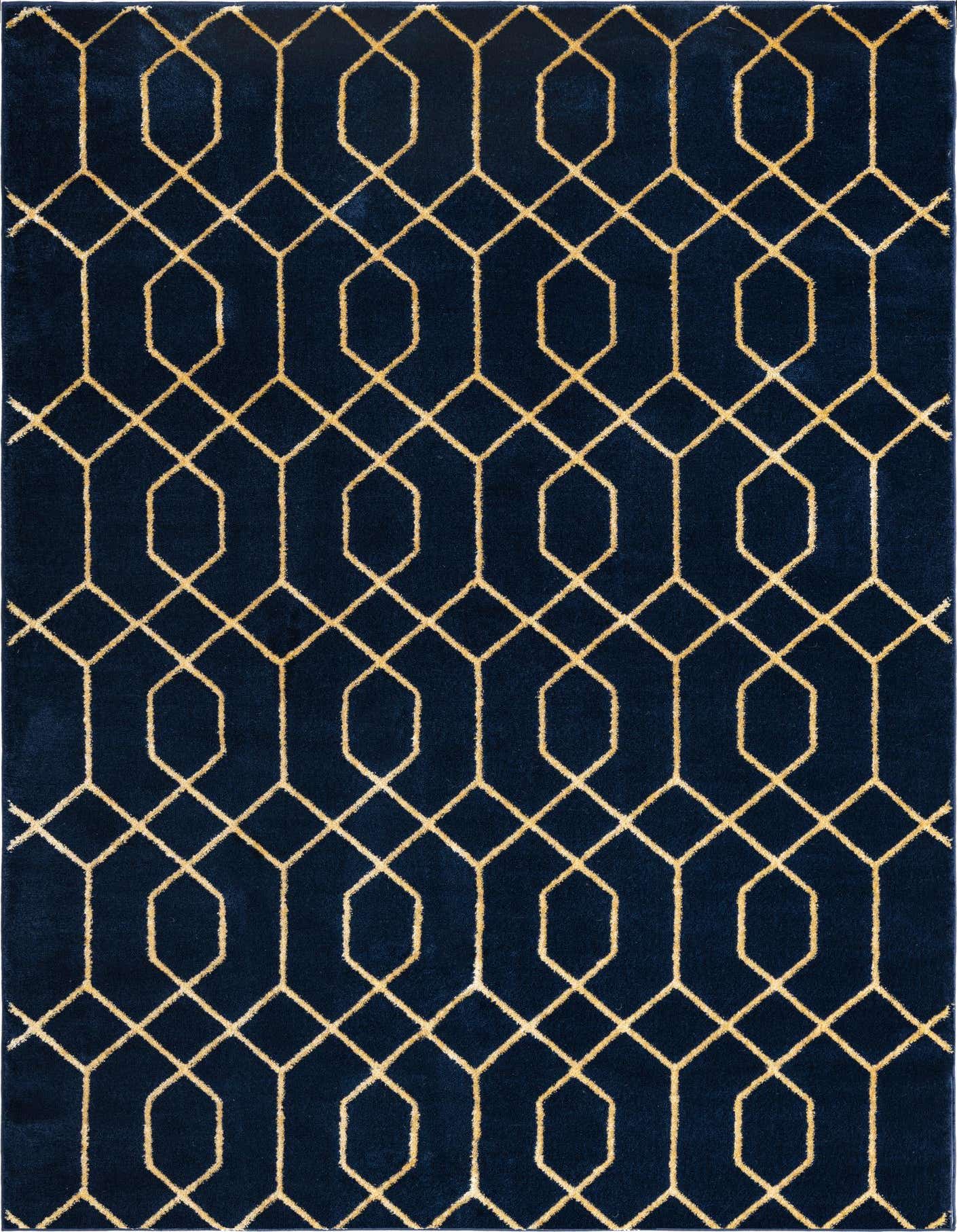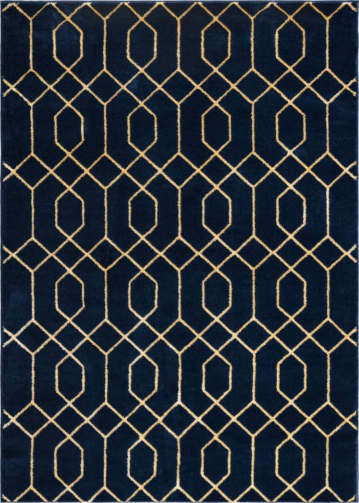 A 7x10 rectangular navy blue rug with a repeating gold modern trellis pattern, suitable for a living room.