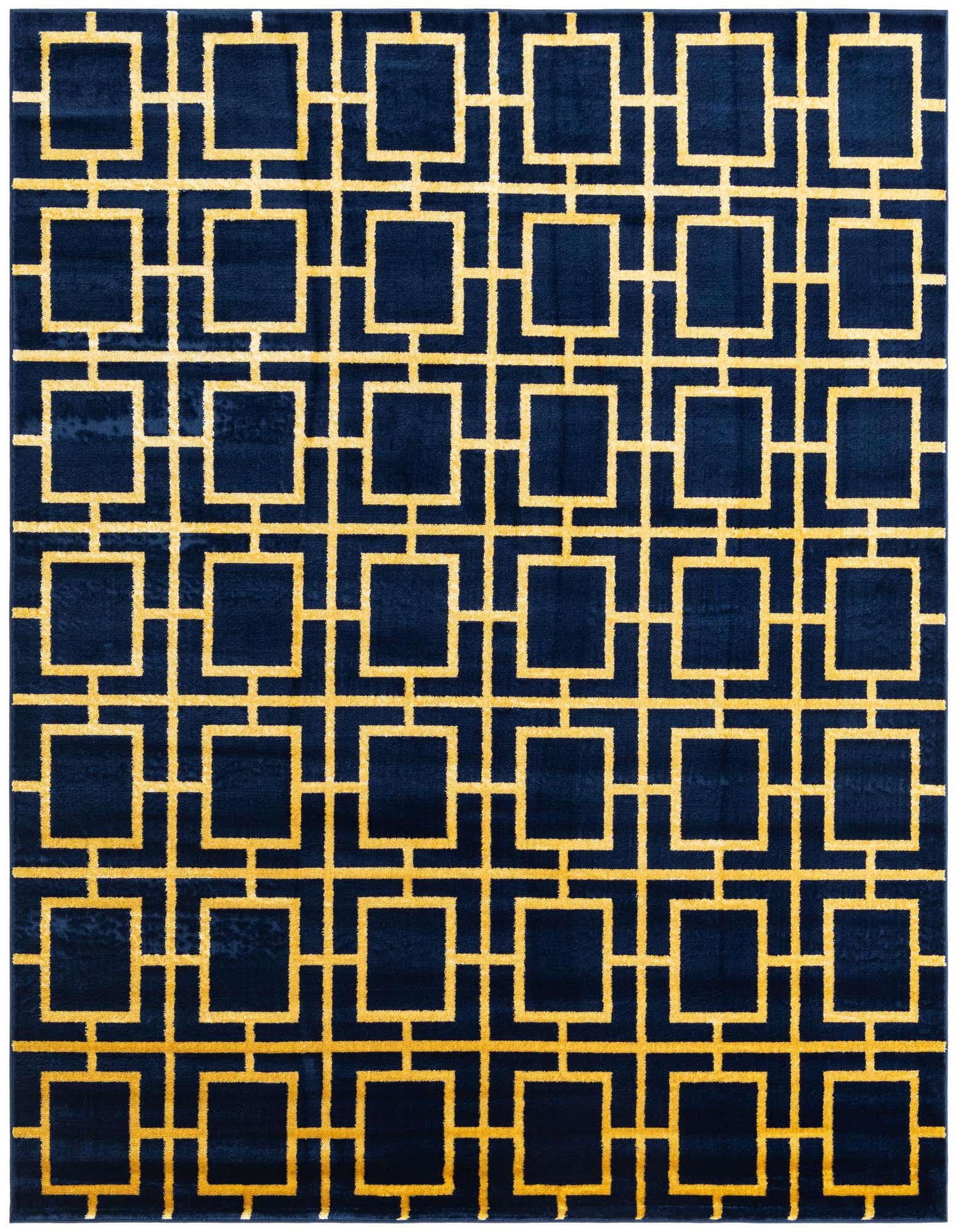 A rectangular 8x10 blue area rug featuring a bold yellow-gold geometric trellis pattern, ideal for a living room.