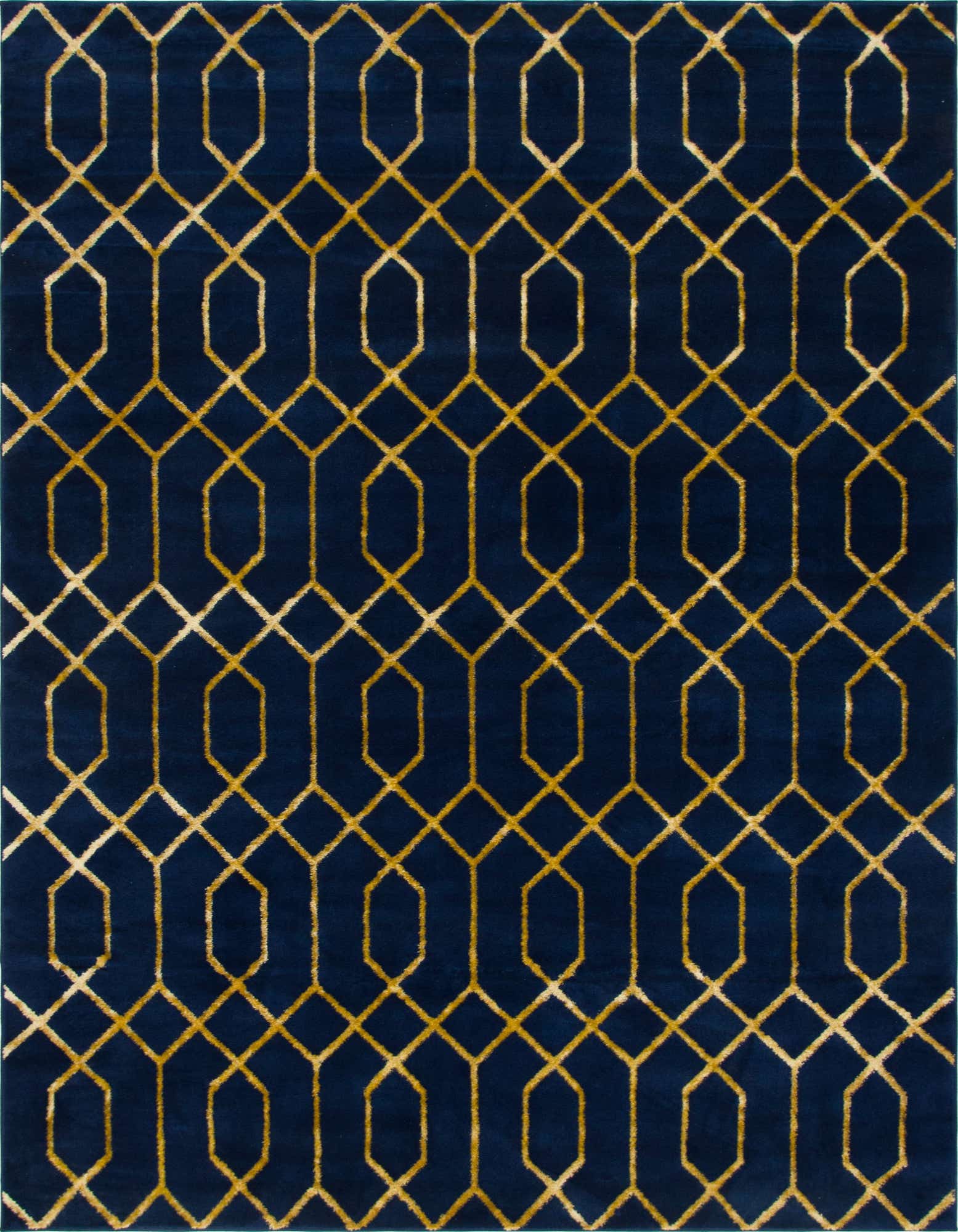 The Marilyn Monroe™ Glam Trellis collection presents an 8x10 area rug that showcases a compelling trellis pattern in a rich navy blue gold background with gold accents. Crafted with precision, it is machine-woven from a resilient blend of 70% Polypropylene and 30% Polyester, offering a soft texture that is both durable and shed-free. This piece champions a sophisticated aesthetic with its defined geometric motif, affording it a contemporary charm that complements an array of home furnishings.