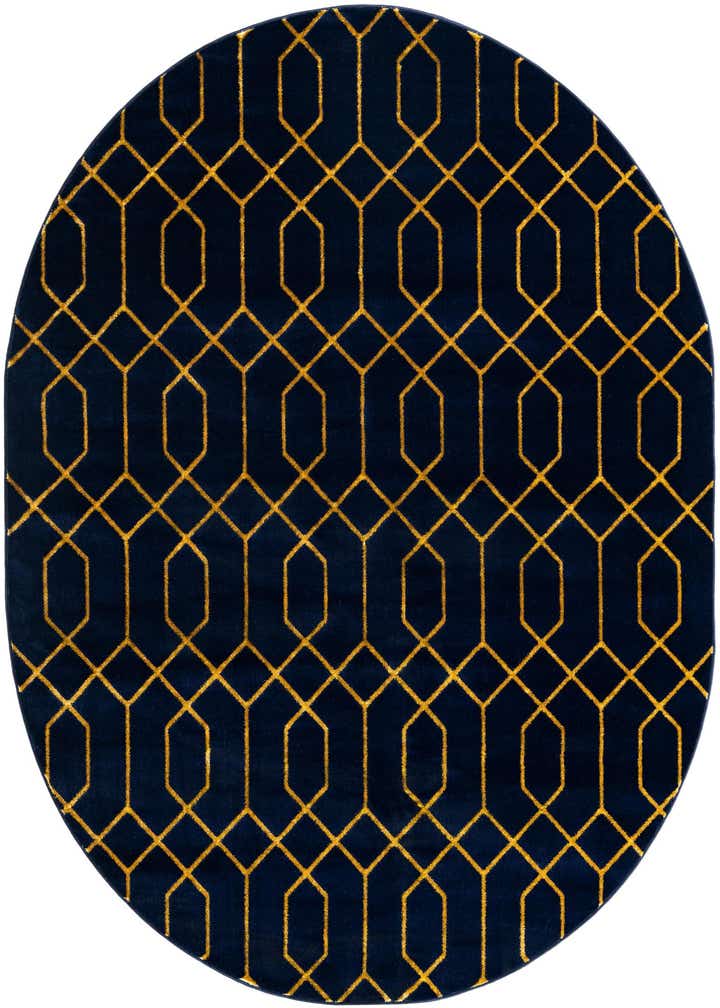 Machine-made from 70% polypropylene and 30% polyester, this oval rug pairs a deep navy-blue field with a repeating gold trellis for a modern, geometric look. The pattern consists of elongated hexagonal links and intersecting lines that create a steady, art-deco–inspired rhythm across the surface. The pile has a smooth, velvety hand with a subtle sheen that catches light on the gold lines, giving the motif added dimension against the rich navy background.