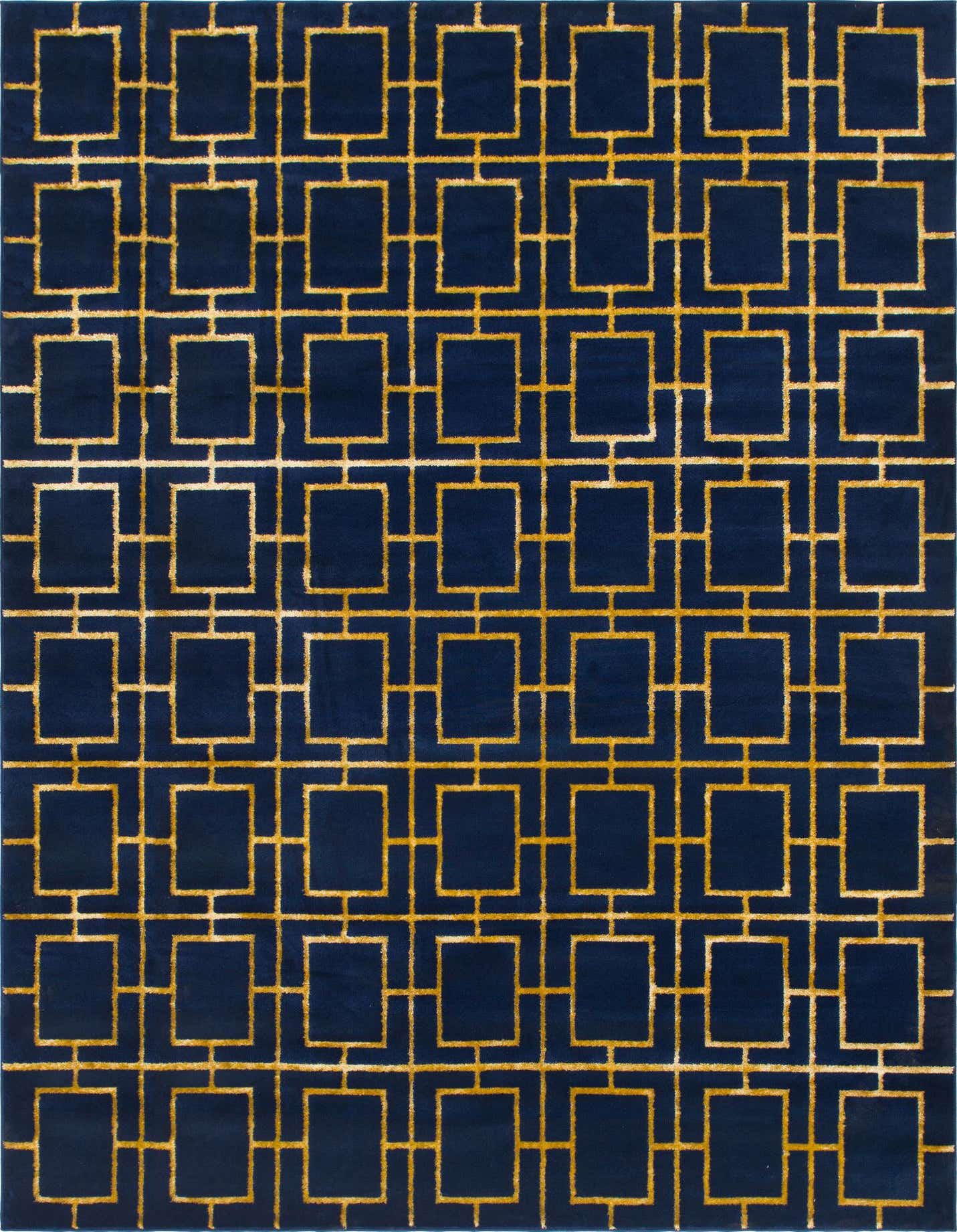 A crisp geometric trellis lays across a navy blue gold background, forming a regular grid of gold-outlined rectangles that catch the light. The pattern balances a modern, architectural feel with a touch of glamour; the gold pile has a subtle luster while the deep navy base provides a rich, grounding contrast. Machine made from 70% polypropylene and 30% polyester, the rug has a soft, low-to-medium pile that feels pleasant underfoot and holds the pattern’s clean edges.