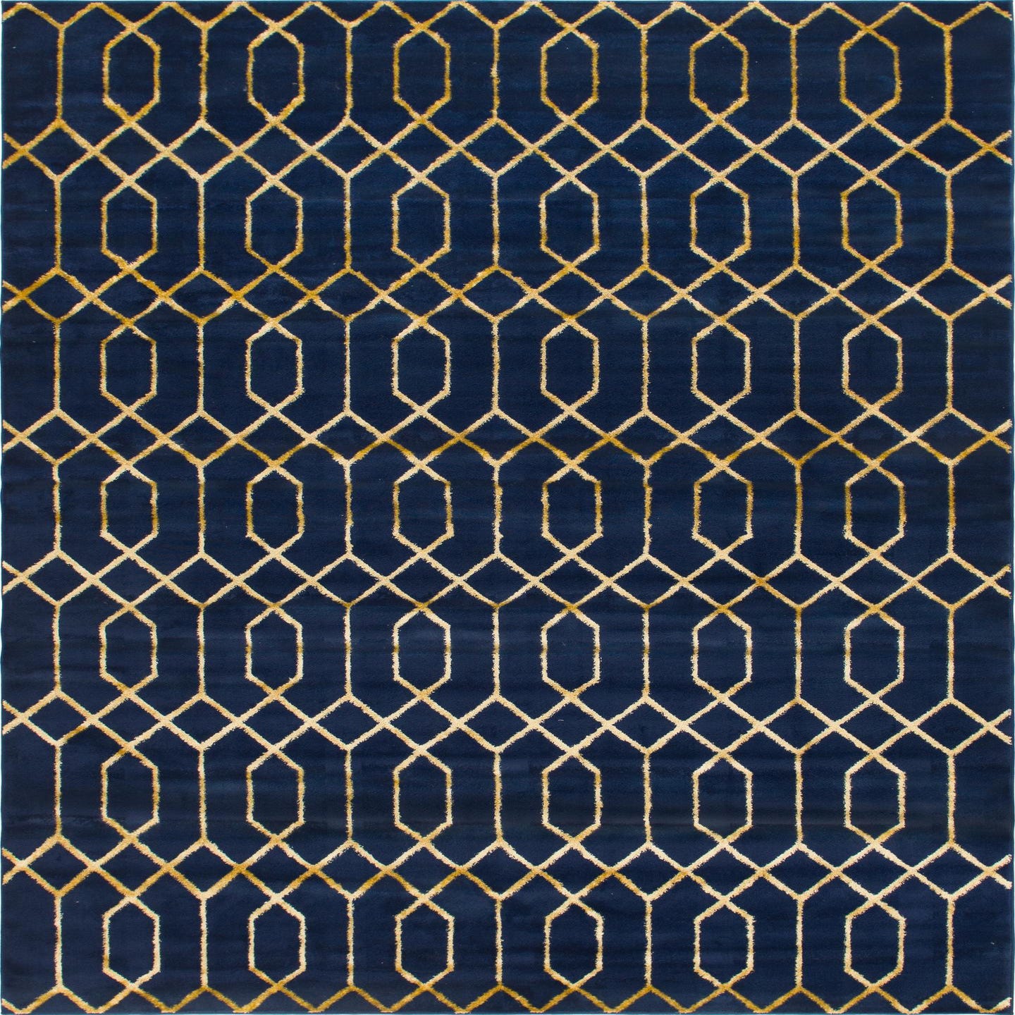 A bold geometric trellis pattern in rich navy blue and gold defines this rug. Interlocking elongated hexagons and diamond links form a regular lattice that reads modern with an Art Deco influence. The navy background is deep and even, while the gold yarns bring a warm, slightly lustrous contrast — the lines have a gently textured edge that gives the pattern a handcrafted feel. Machine-made from 70% polypropylene and 30% polyester, the surface has a soft, velvety touch with enough body to feel substantial underfoot while the polyester fibers add a subtle sheen to the gold accents.