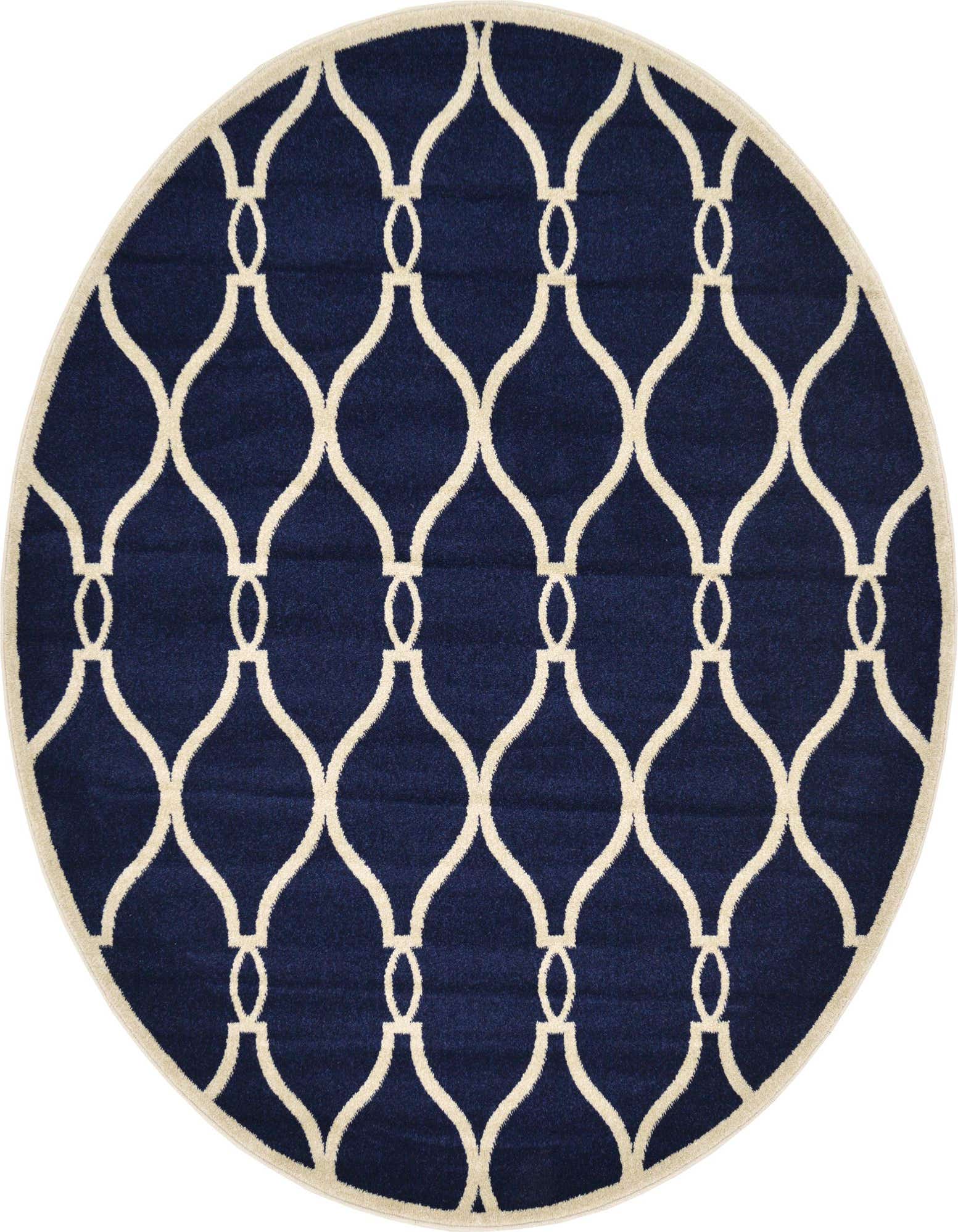 The Lattice collection rug presents a timeless geometric pattern that adds an element of sophisticated charm to any space. This round rug features a repeating lattice design in cream set against a rich navy blue background, creating a bold contrast that captures the eye. The machine-woven construction of 100% polypropylene ensures durability, while the stain-resistant quality makes it a practical choice for high-traffic areas.