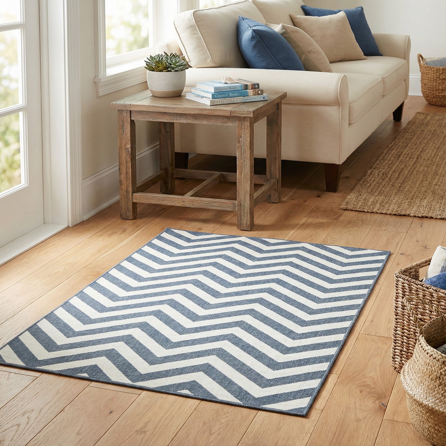 This sample works well wherever a coastal or modern-casual vibe is wanted: layered on a covered porch or balcony, under a casual dining table, in a sunroom or mudroom, or placed at an entry to make a defined statement. Pair it with light-washed woods, rattan furniture, and neutral linens for a breezy beach-house look, or use it to anchor navy and ivory accents in a contemporary living room for a refreshed, structured feel. This piece is a sample.