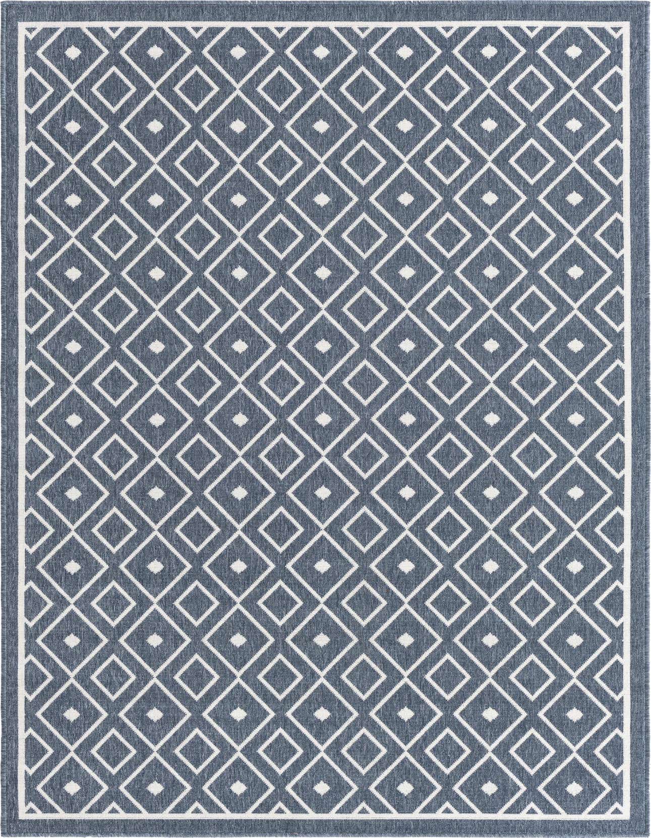 A rectangular navy blue and white Scandinavian-style flatweave rug sample with a repeating diamond pattern, suitable for indoor or outdoor use.