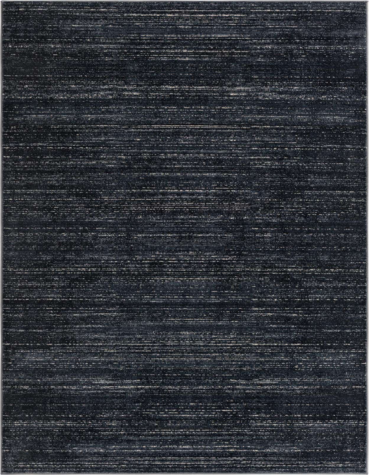 A deep navy blue field is threaded with fine, horizontal ivory and lighter-blue striations that create a low-contrast, weathered linear pattern. The machine-made construction and the 70% polypropylene / 30% polyester blend produce a low-profile pile with a smooth, slightly plush hand and a subtle sheen where the polyester catches the light. The overall effect is a refined, tonal surface that feels soft underfoot while maintaining a neat, tailored appearance. This piece is a Sample.
