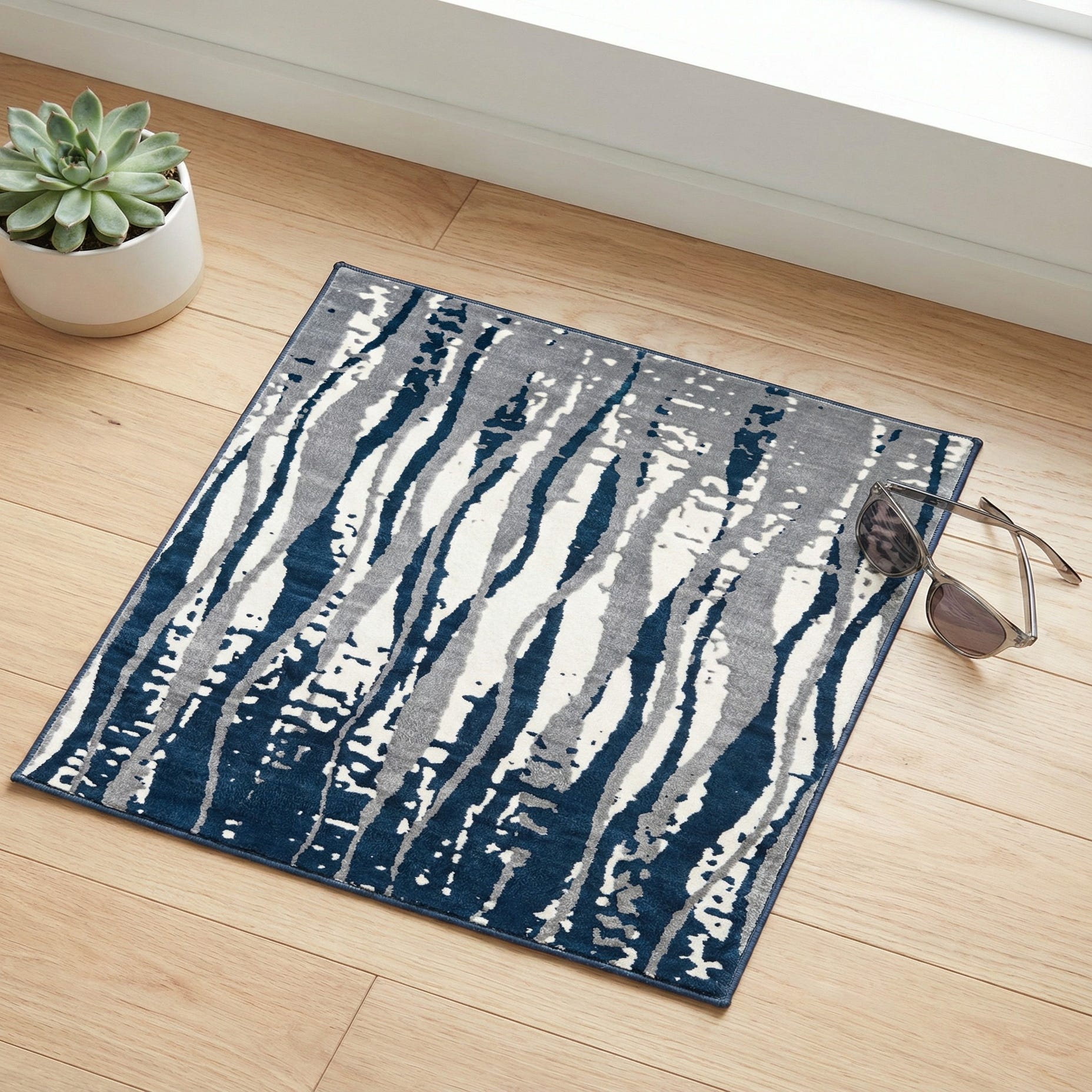 This machine-made sample presents an abstract vertical-stripe pattern of irregular, painterly streaks in gray and ivory layered over a navy blue background. The design reads like hand-applied brushstrokes, with strong vertical movement that adds visual height to a room. Made from 60% polypropylene and 40% polyester, the rug has a soft, low-profile pile with a smooth, slightly velvety hand that keeps the pattern crisp while offering comfortable underfoot texture.