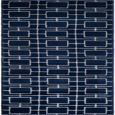 Deep navy-blue-silver forms the rug’s ground while a crisp silver geometric trellis of linked rectangles runs across the surface, giving a modern, tailored look. The repeating rectangular motif creates visual structure without feeling busy, and the contrast between the deep background and the lighter silver lines keeps the pattern clean and graphic.