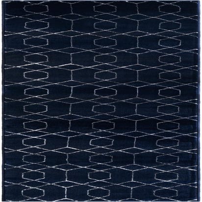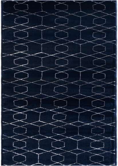 A repeating trellis of elongated octagons and diamond links sits over a deep Navy Blue Silver ground, the geometric pattern rendered in contrasting silver to create subtle contrast and visual rhythm. Machine made from 70% polypropylene and 30% polyester, the rug delivers a soft, low-profile pile with a slight lustrous quality where the silver yarns catch the light, giving the surface gentle shimmer and a tactile, smooth hand underfoot.