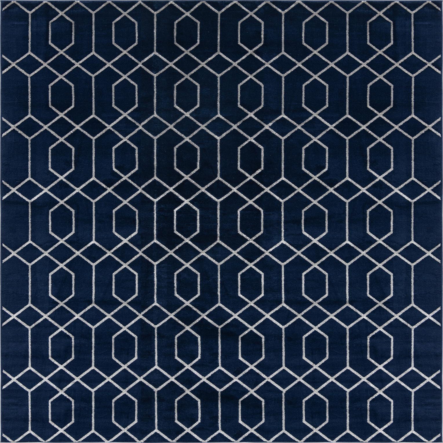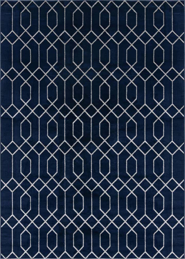 This machine-made rug in a 70% polypropylene / 30% polyester blend pairs a deep Navy Blue Silver background with a crisp silver geometric trellis. Interlocking elongated octagons and diamond crossings form a balanced lattice that runs across the surface, with the silver motif sitting in subtle relief against the navy field. The polypropylene provides a smooth, low-profile pile while the polyester gives the silver lines a soft sheen and a pleasant hand underfoot.