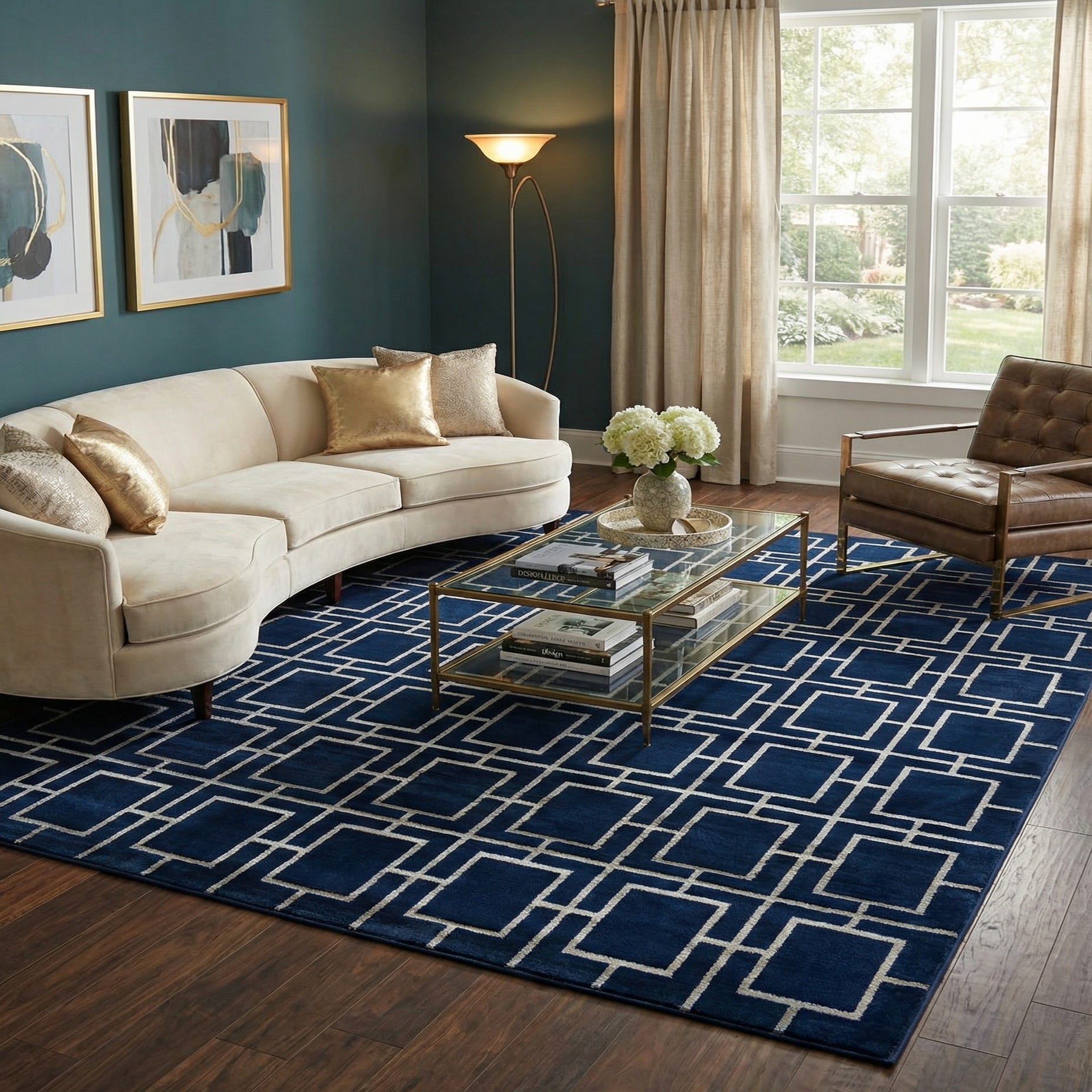 A bold geometric trellis of interlocking squares and rectangles sits on a rich Navy Blue Silver ground, the silver pattern tracing a crisp grid across the deep navy field. The contrast between the cool metallic silver lines and the saturated navy creates a modern, graphic look that reads structured without feeling busy. Machine-made from 70% polypropylene and 30% polyester, the rug has a low, velvety pile underfoot with the silver motif carrying a slightly raised, tactile definition that you can both see and feel.