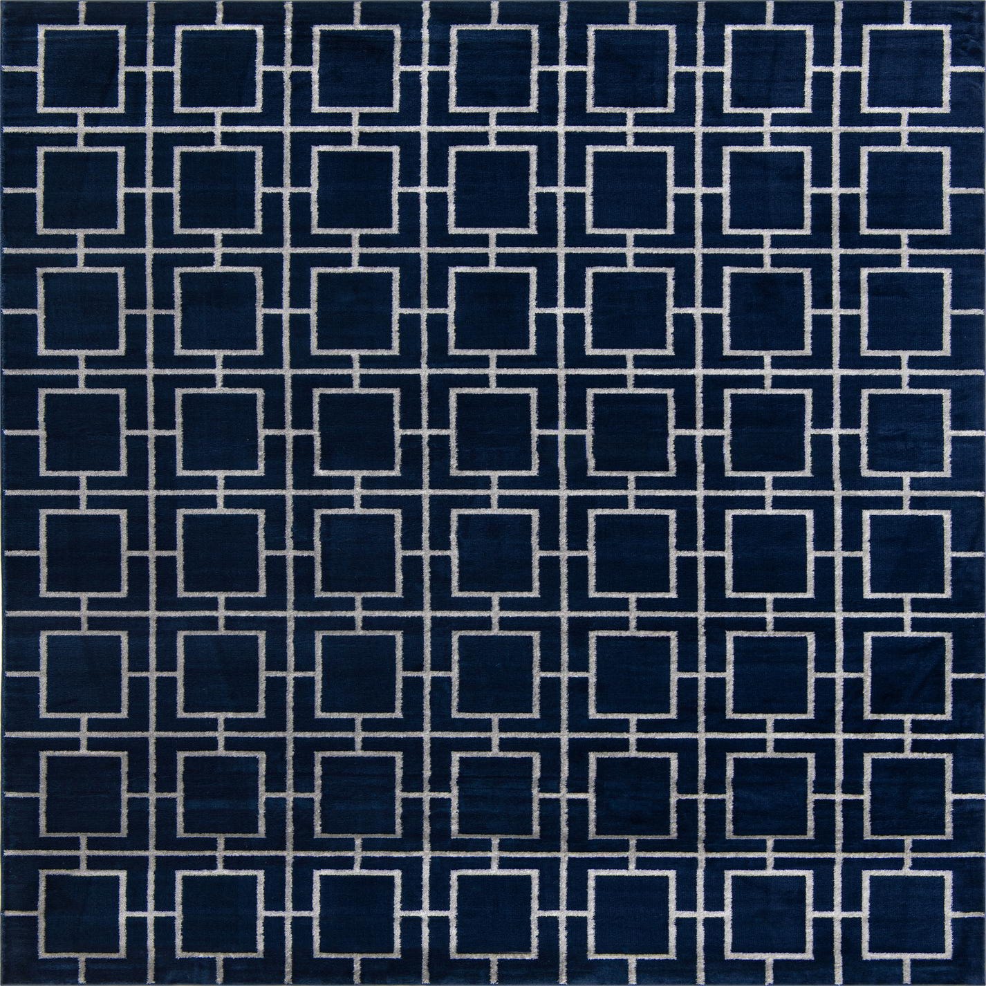 A bold geometric trellis of interlocking squares and rectangles sits on a rich Navy Blue Silver ground, the silver pattern tracing a crisp grid across the deep navy field. The contrast between the cool metallic silver lines and the saturated navy creates a modern, graphic look that reads structured without feeling busy. Machine-made from 70% polypropylene and 30% polyester, the rug has a low, velvety pile underfoot with the silver motif carrying a slightly raised, tactile definition that you can both see and feel.