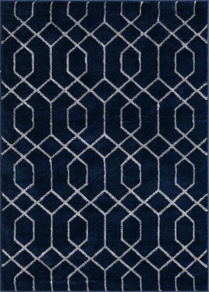 A deep navy-blue field sets the stage for a crisp silver trellis pattern, forming an arranged lattice of elongated hexagons that reads modern with a classic influence. The machine-made construction uses 70% polypropylene and 30% polyester, giving the surface a dense, velvety hand with a low-profile pile and a gentle sheen where the silver yarns catch the light. The contrast between the rich navy background and the cool silver lines creates a clean, tailored look without feeling ornate.